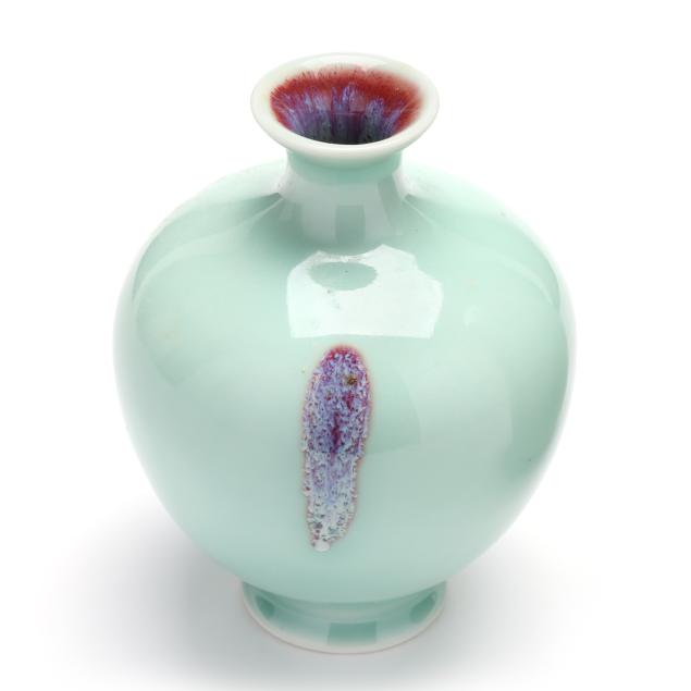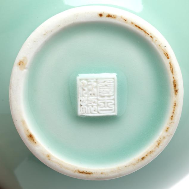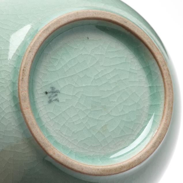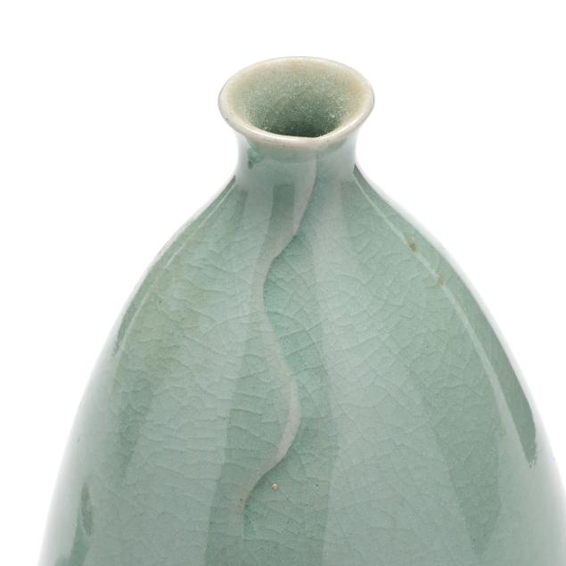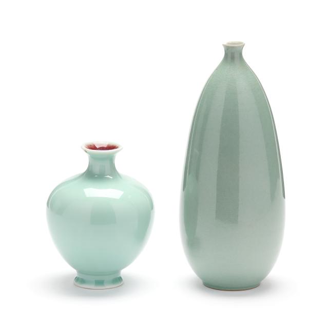 20th century, two celadon glazed vessels, the first is Korean and has an elongated body with very short neck and small mouth, the other in a Chinese style, with a raised four character seal to the underside in white.