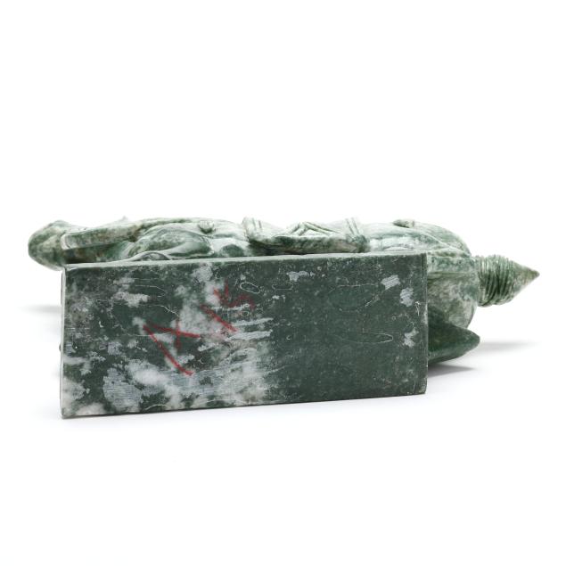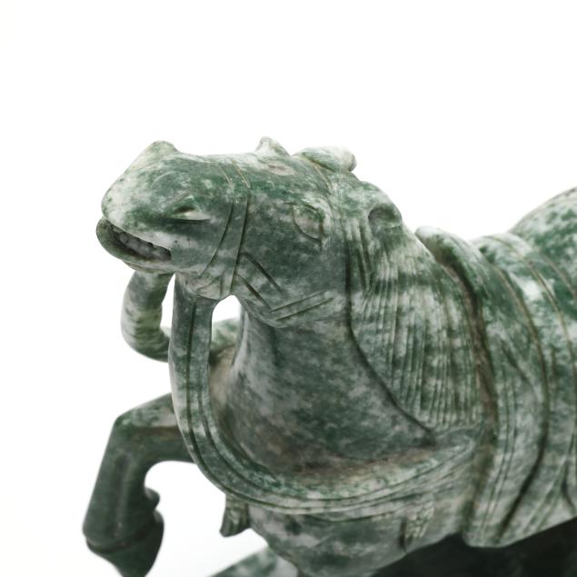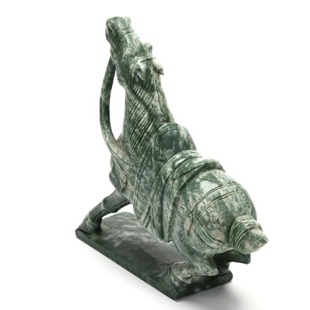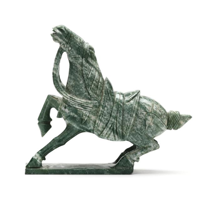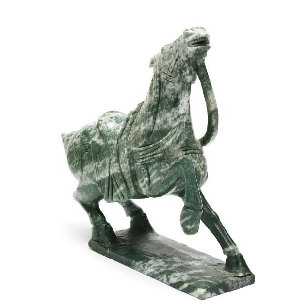 Late 20th century, a carved marbled green and white hardstone sculpture of a Tang dynasty style horse, head is raised upwards, with one front leg raised as if about to gallop off, carved standing on a plinth of same material.