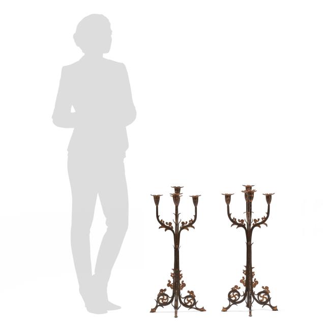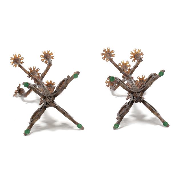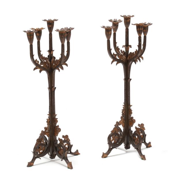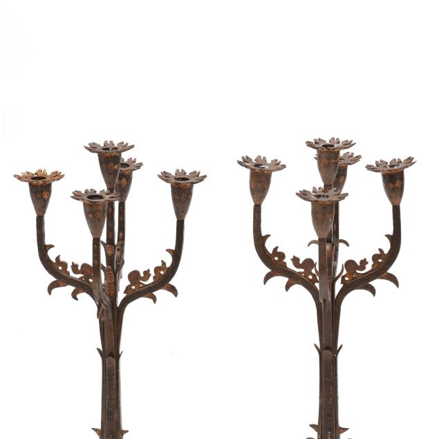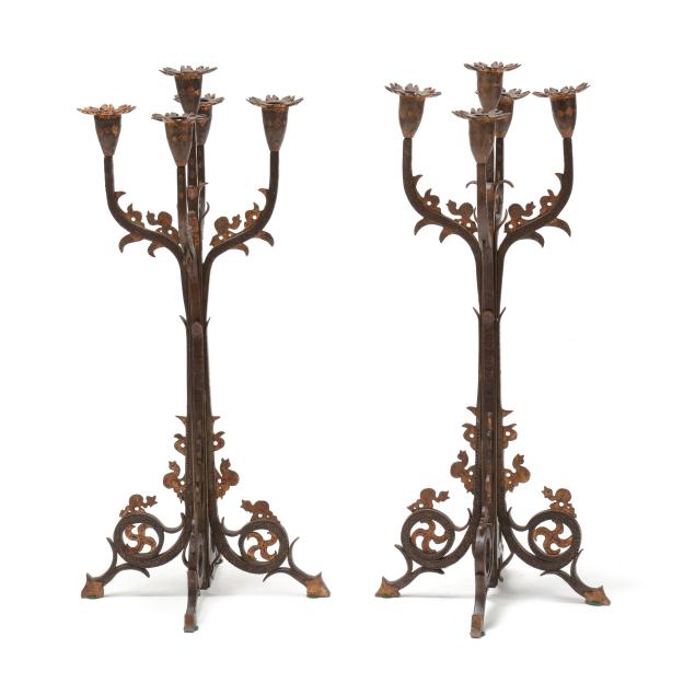 First quarter 20th century, patinated and gilt wrought iron, unsigned, five-light forms comprising four upswept arms flanking a central rising standard, terminating in a conical nozzle with attached geometric pierced bobeches, the whole with engraved line work and mounted with stylized animal and foliate mounts, raised on scrolled legs.