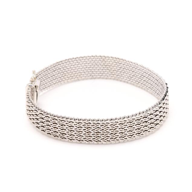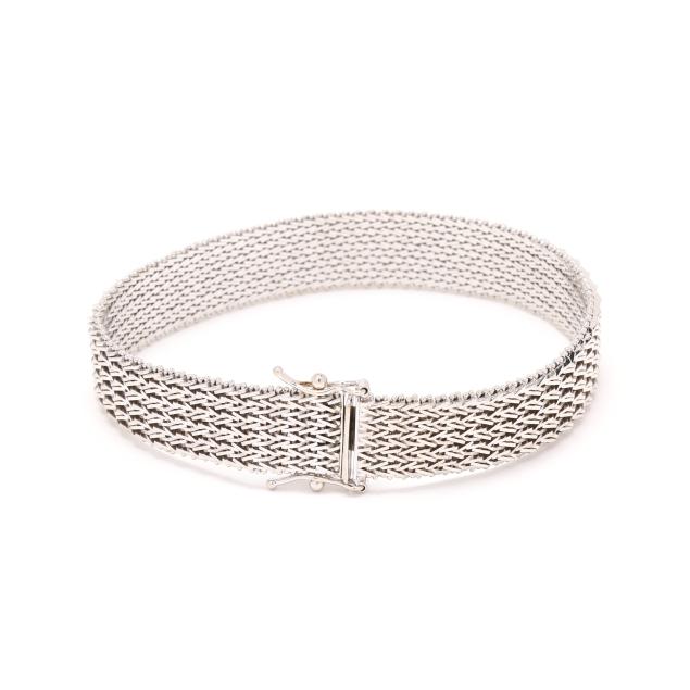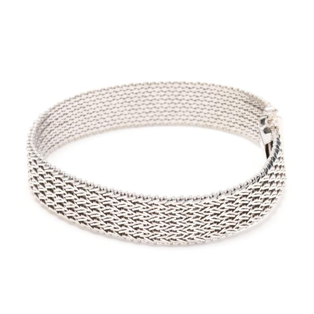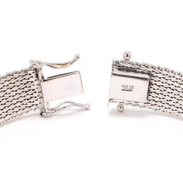 Polished geometric links, completed with an integrated box clasp and two figure eight safeties, stamped 14K IG Mexico.