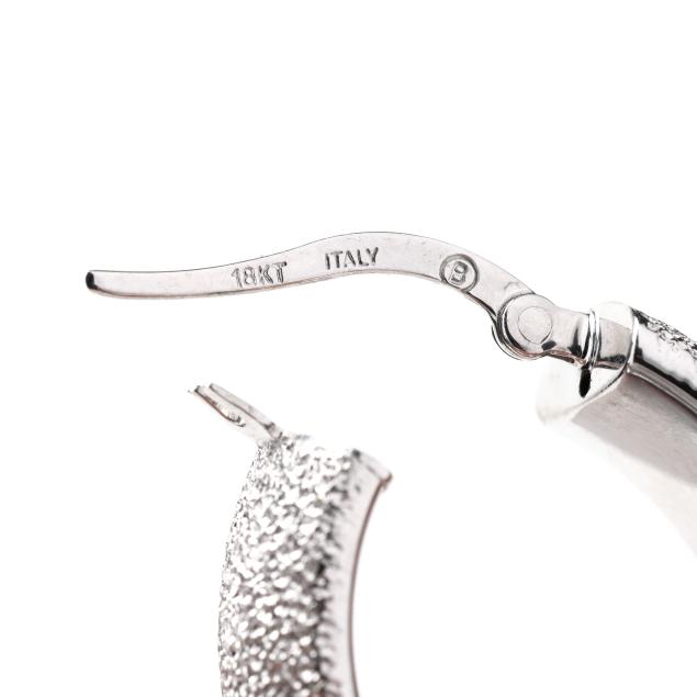 Earrings with textured finish, completed with hinged post, stamped 18KT / Italy and with maker's mark.