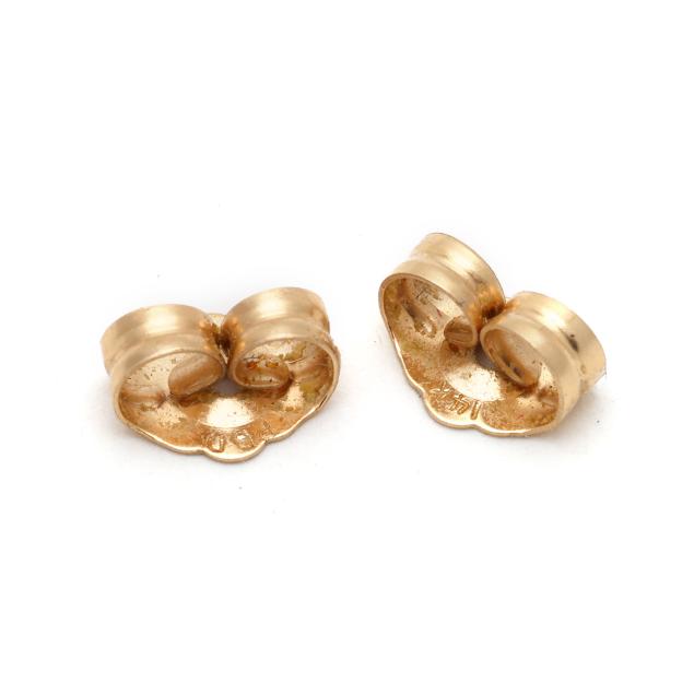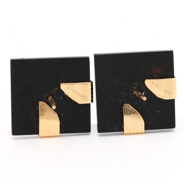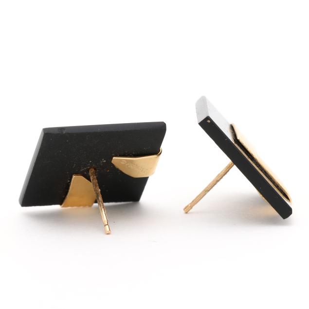 The square tablet cut black onyx with gold band, completed with a post and friction back, stamped PBD 14KT.