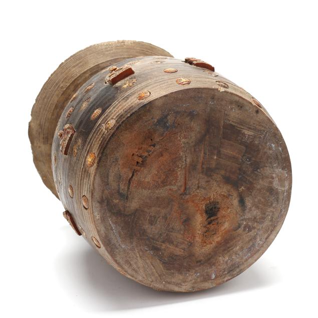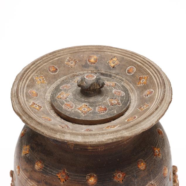 Collection of Mr. John Sylvester, Jr. Small chips to rim; small loss to handle on lid; lid unevenly secured to jar; surface marks and staining to wood.