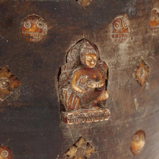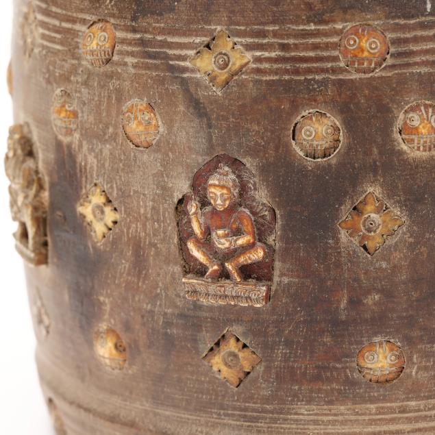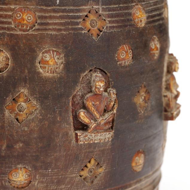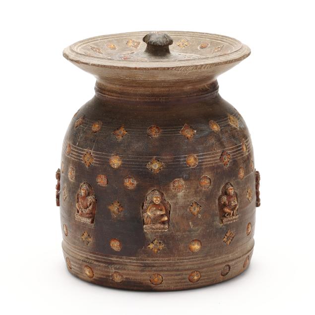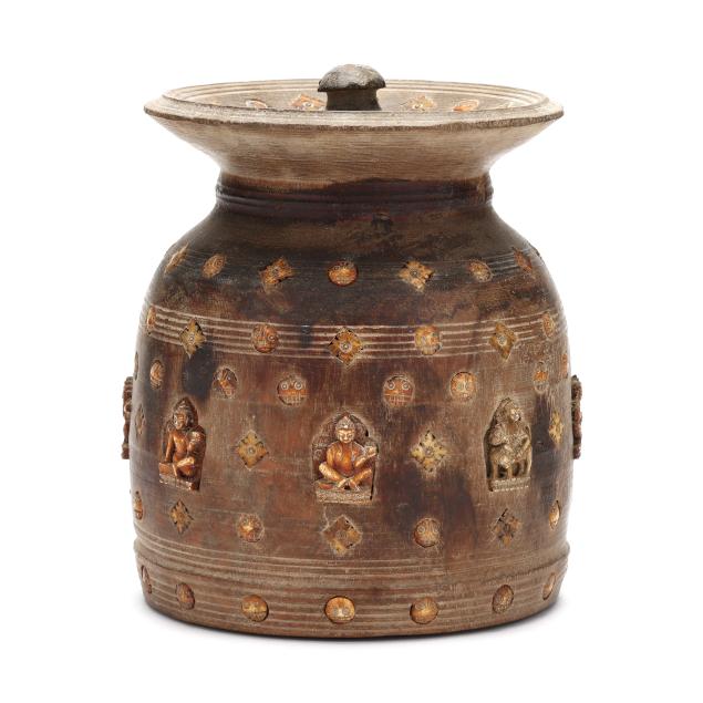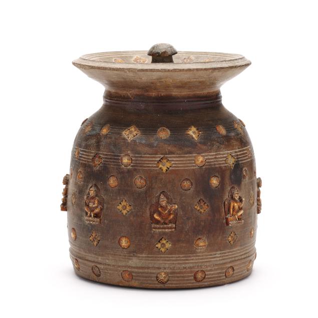 Late 19th or early 20th century, carved wood jar with fitted lid, decorated with shaped niches containing Buddhist figures.