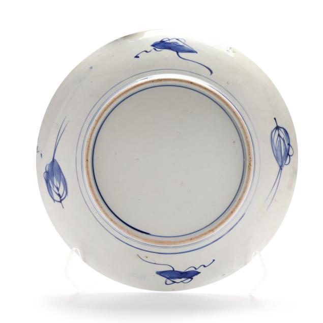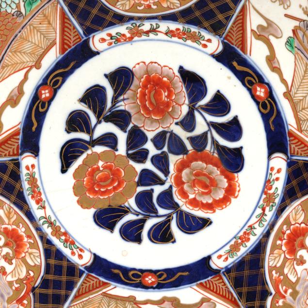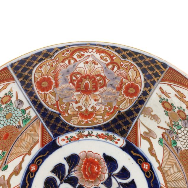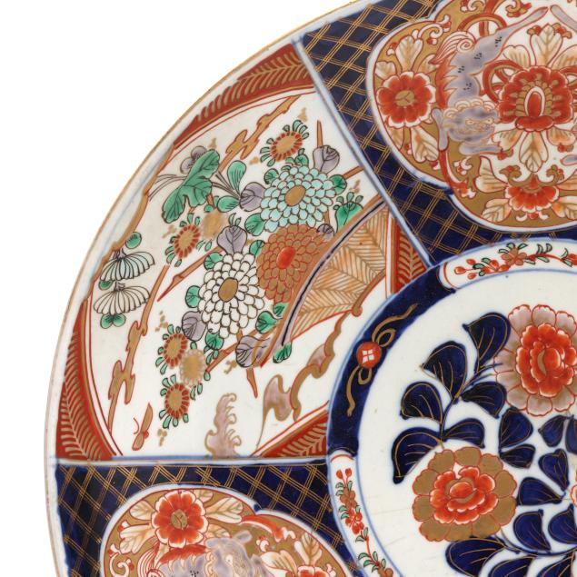 Meiji period (1868-1912), a large charger finely hand painted in the Imari palette with repeating shaped vignettes containing lush flora and ornate patterns surrounding a central medallion with three blooms against dark blue leaves, with three kiln spur marks to the underside.