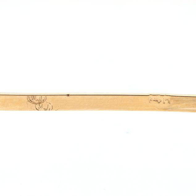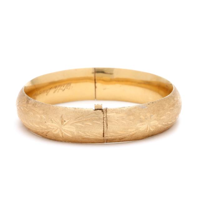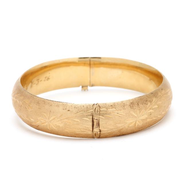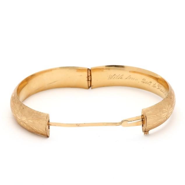 The hinged gold bangle with textured finish and bright cut engraving, completed with an integrated clasp, interior with a presentation engraving dated 11-3-86, stamped 14K / M.J.