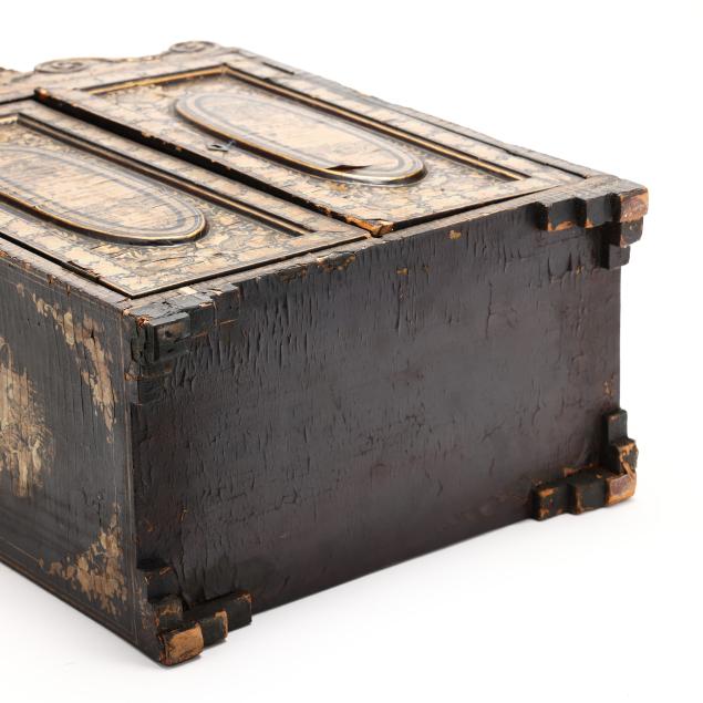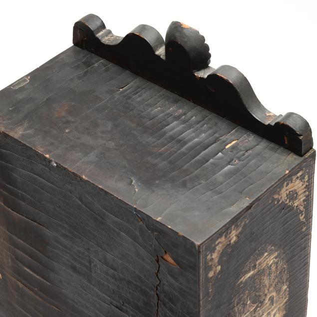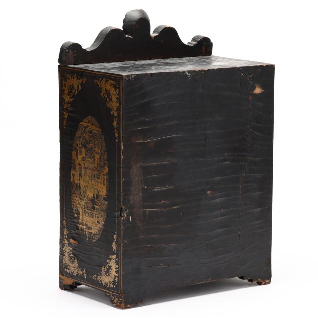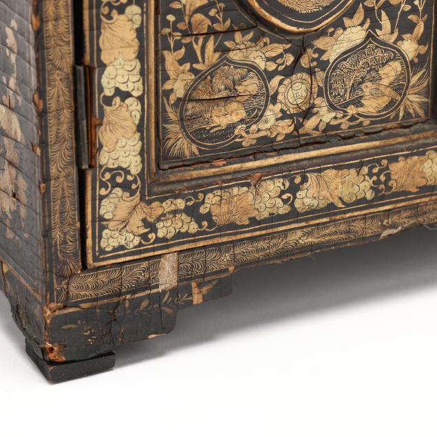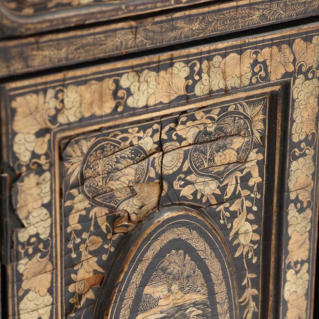 Cracking, warping, and minor losses to lacquer to whole; small chip to shell pediment; a few small areas of loss to wood.