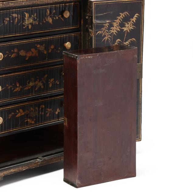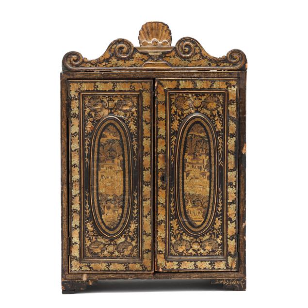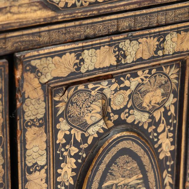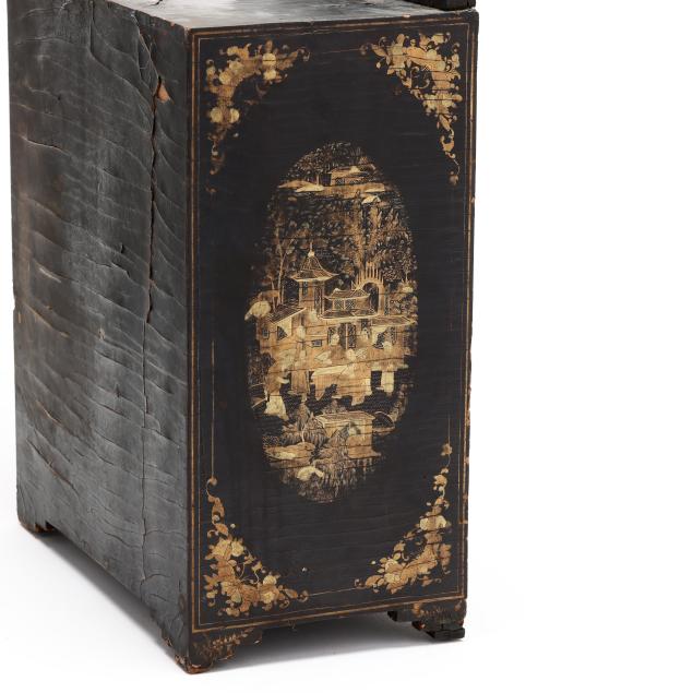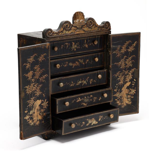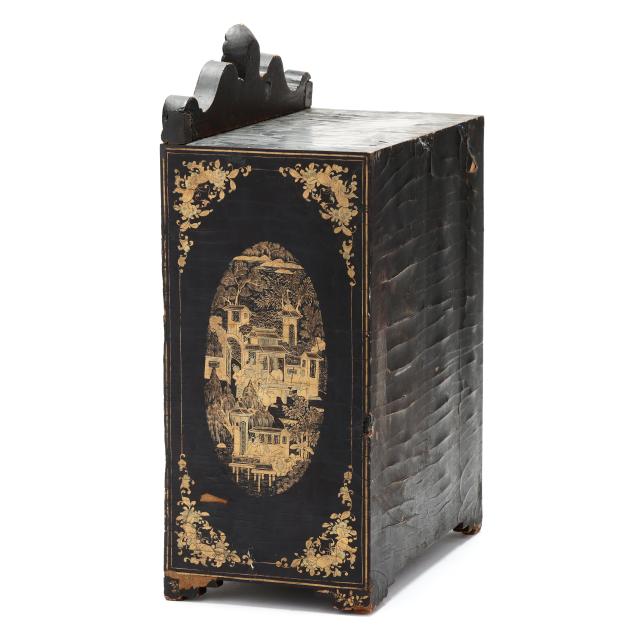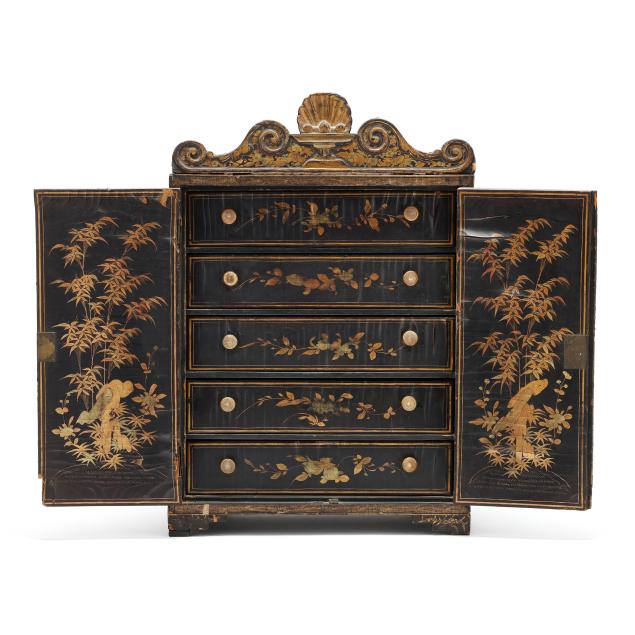 19th century, black lacquer with gilt decoration to whole featuring landscapes and floral and foliate motifs, (2) doors swing open to reveal (5) interior drawers, rests on four feet and culminates in a scrolled pediment with central shell motif.