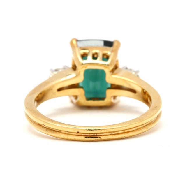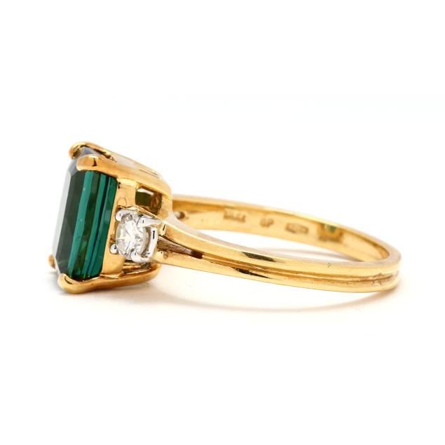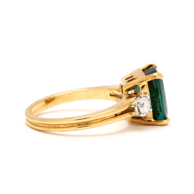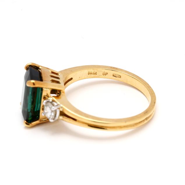 Centered on a rectangular cut green tourmaline (10.27 x 7.65 x 5.40mm) weighing approximately 2.85 carats, and set to each side with a full cut round diamond (3.5mm) weighing approximately .34 carat (H-I color, VS2-SI1 clarity), stamped 18Kt / 750 and with maker's mark GP.