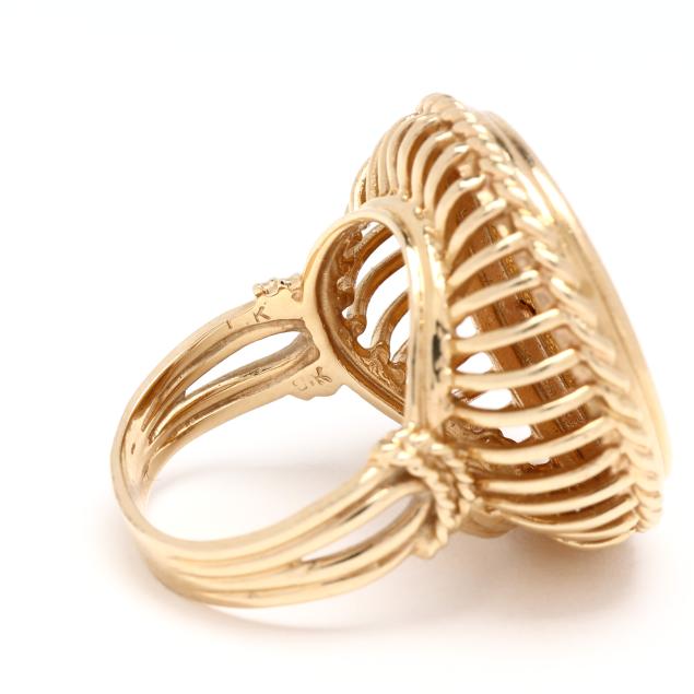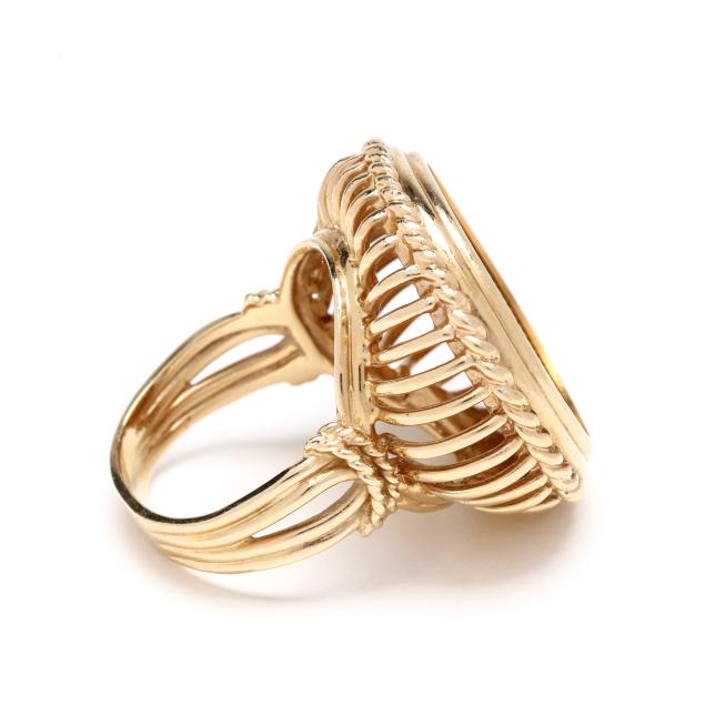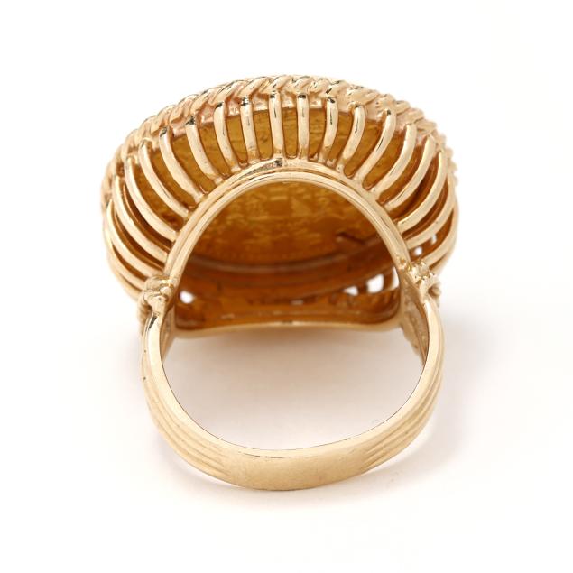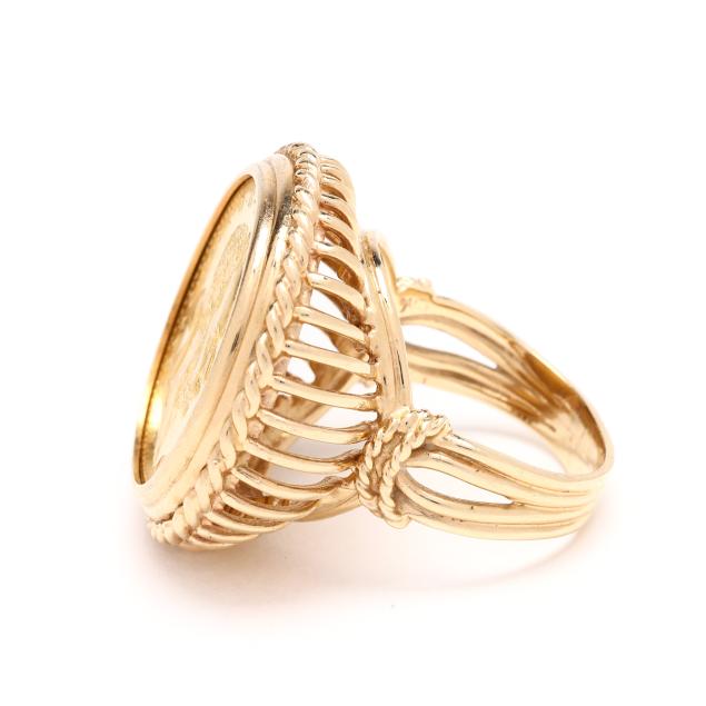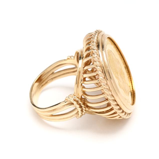 Centered on an Austrian 1 Ducat coin dated 1915 and featuring the bust of Franz Joseph 1, with a gold rope surround, completed with a split shank, stamped with partial marks, testing 14KT.