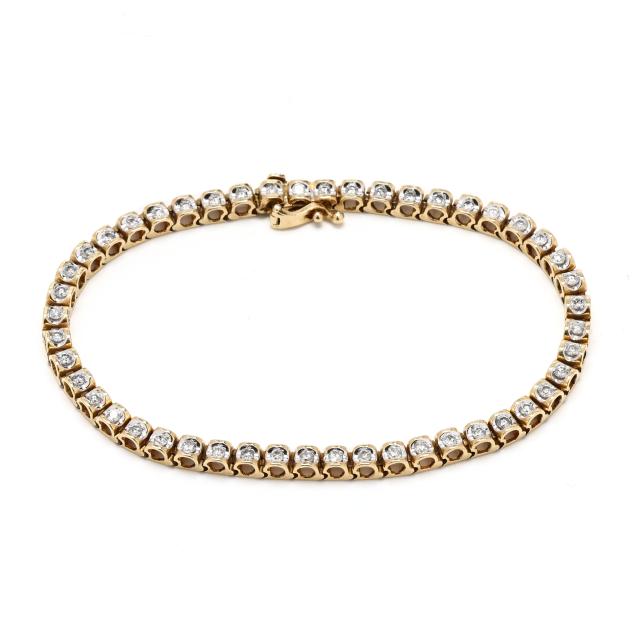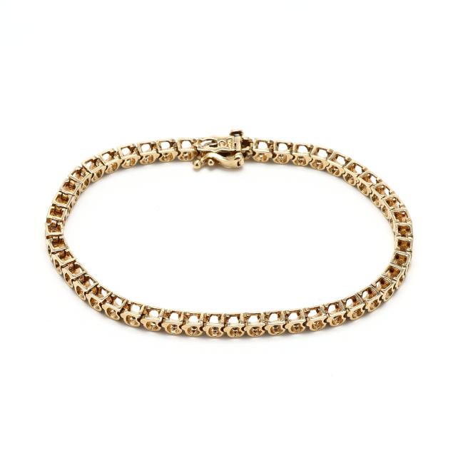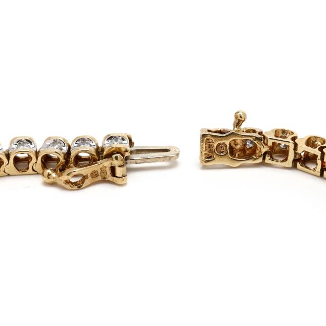 Each link channel set with a full cut round diamond (1.9mm) weighing approximately 1.20 total carats (I-J color, I1-I2 clarity), completed with a box clasp and figure-eight safety, stamped 14K / JAFA.