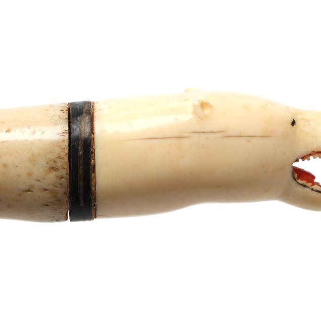 Mid-20th century, carved walrus bone with hand coloring, unsigned, the terminals featuring polar bear heads.