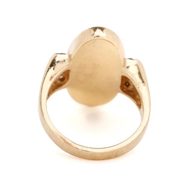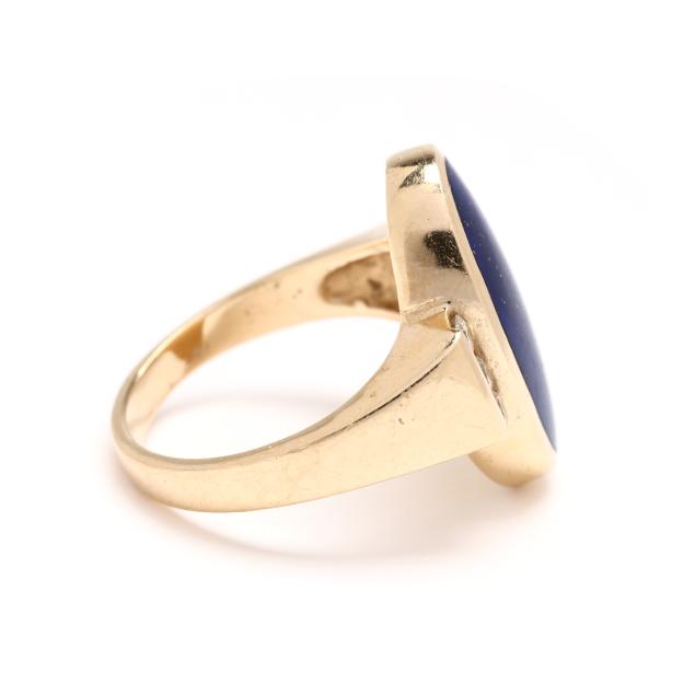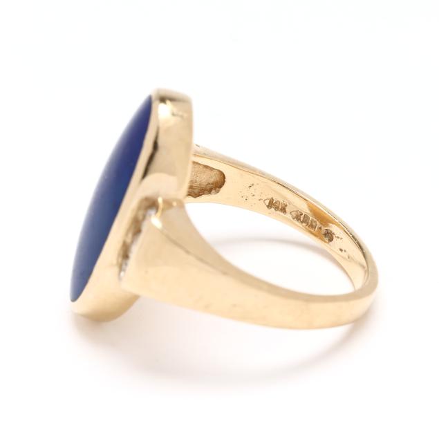 Centered on an oval tablet cut lapis lazuli (17.0 x 9.0mm), set to the shoulders with full cut round diamonds weighing approximately .24 total carat (I-J color, I1 clarity), stamped 14K / KBN.