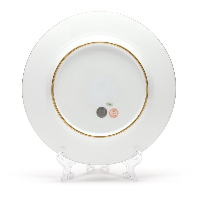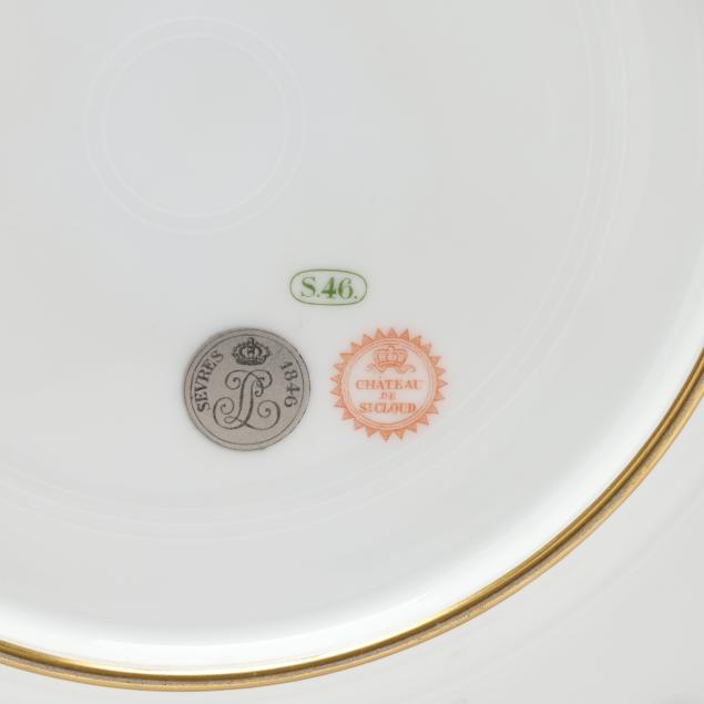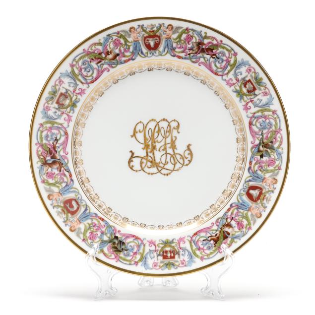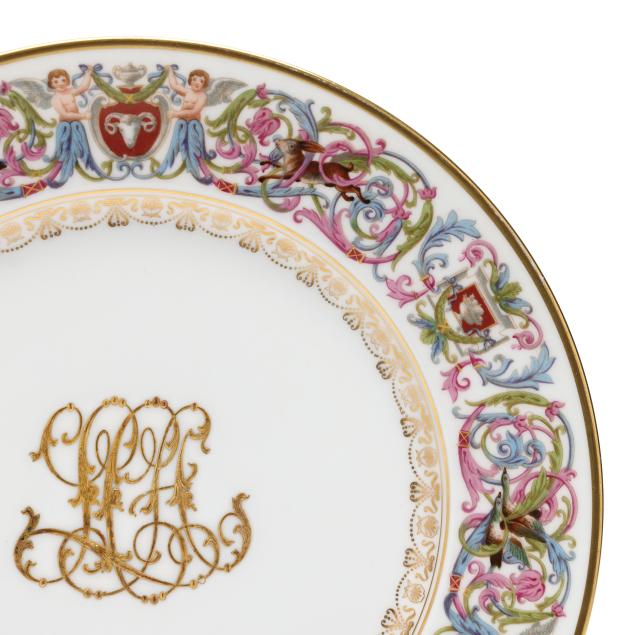 20th century, transfer decorated and gilt porcelain, featuring scrolling and figural designs rims with gilt borders, centering an ornate gilt monogram to the center, bearing 1846 company marks to the verso.
