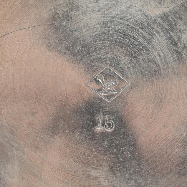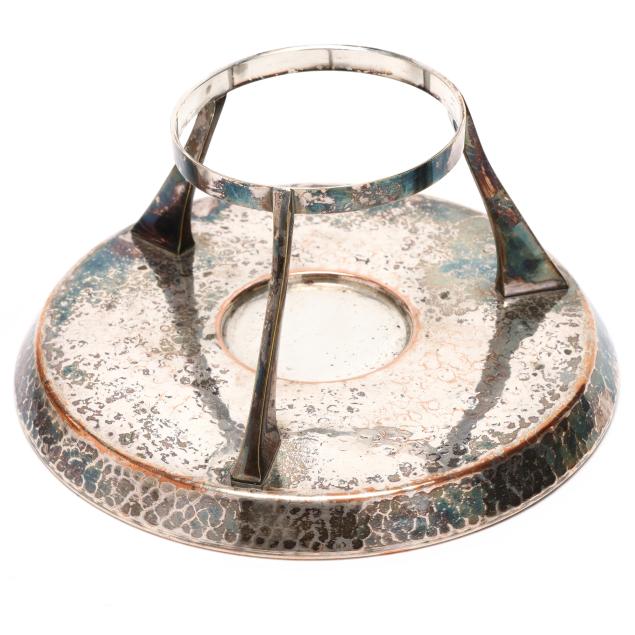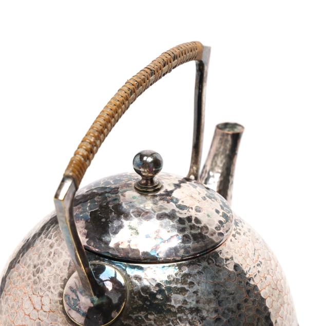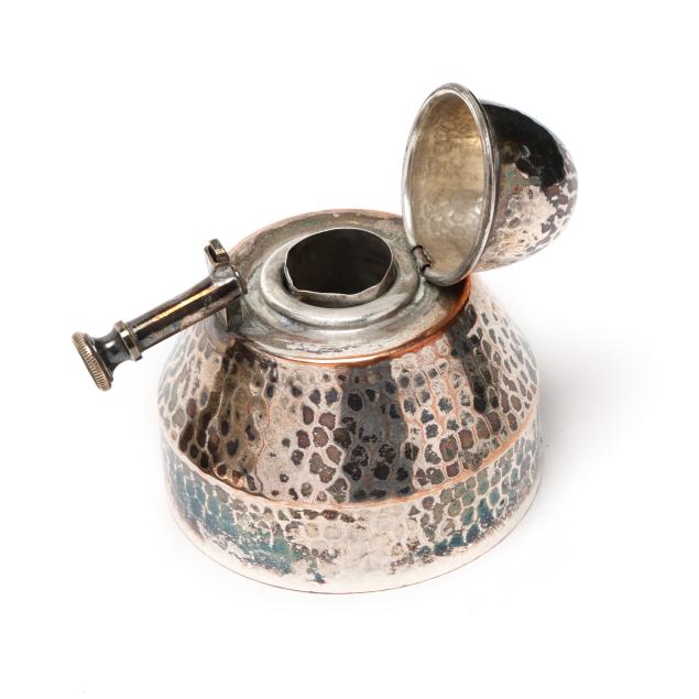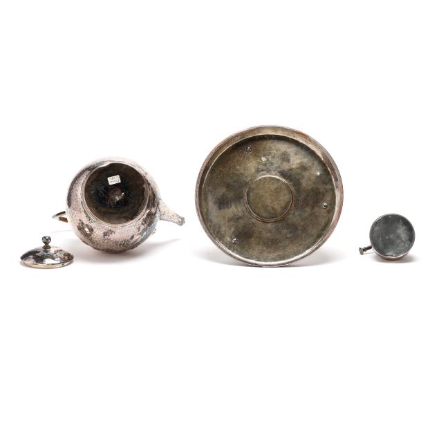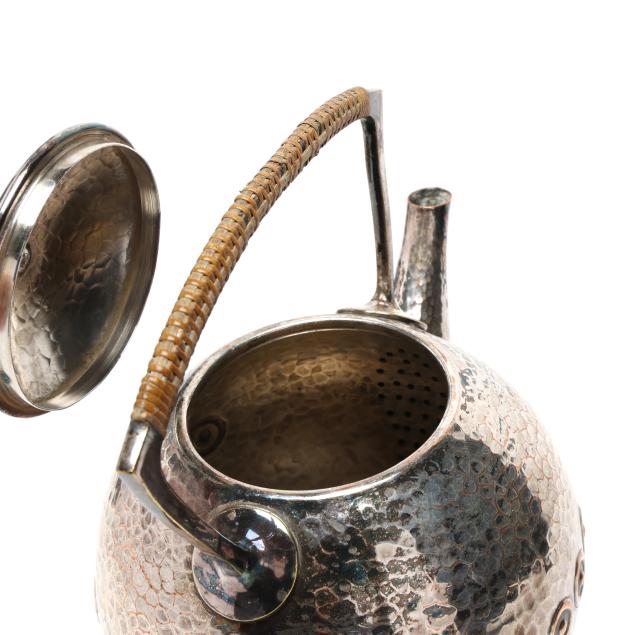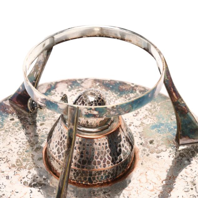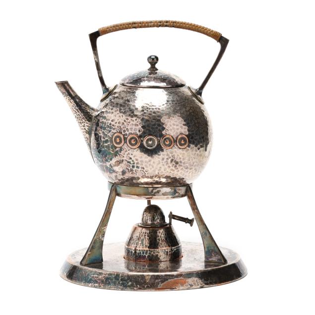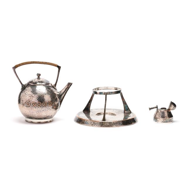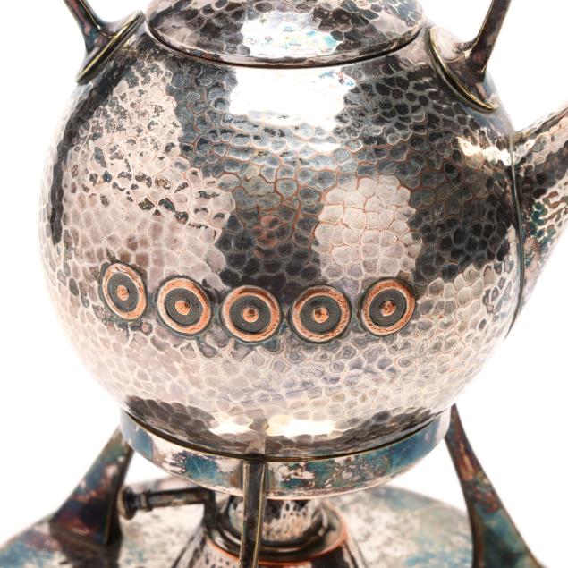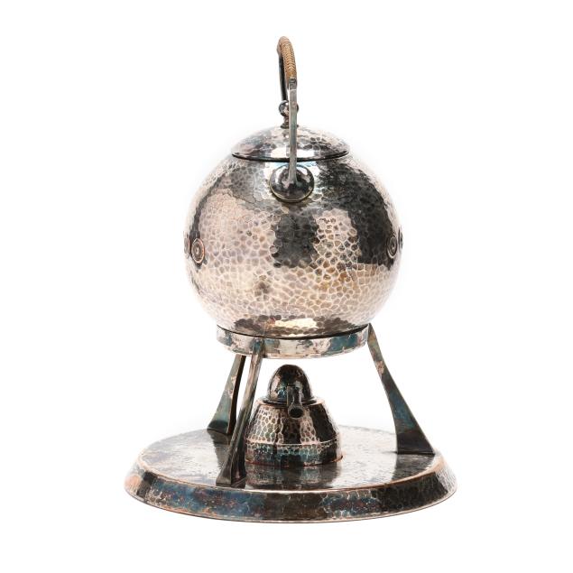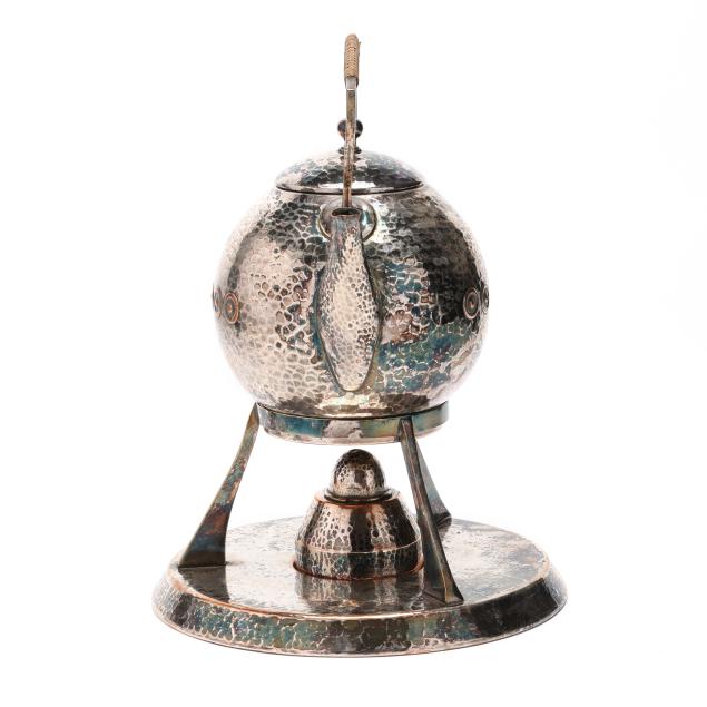 Germany, early 20th century, silver over copper with hand-hammered finish, comprising an ovoid teapot raised atop a conforming round tripodal stand, together with burner, the stand underside impressed company mark and pattern no. 15.