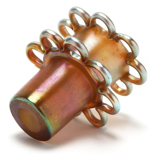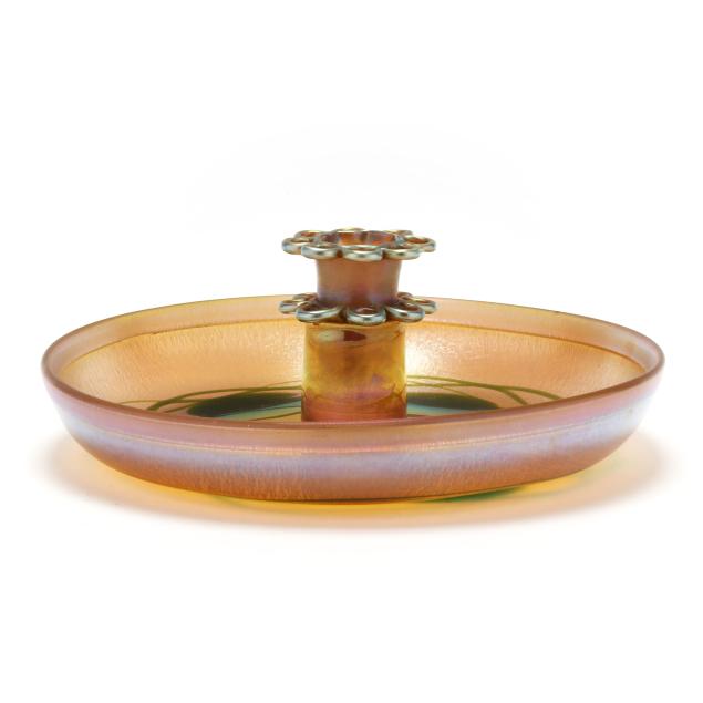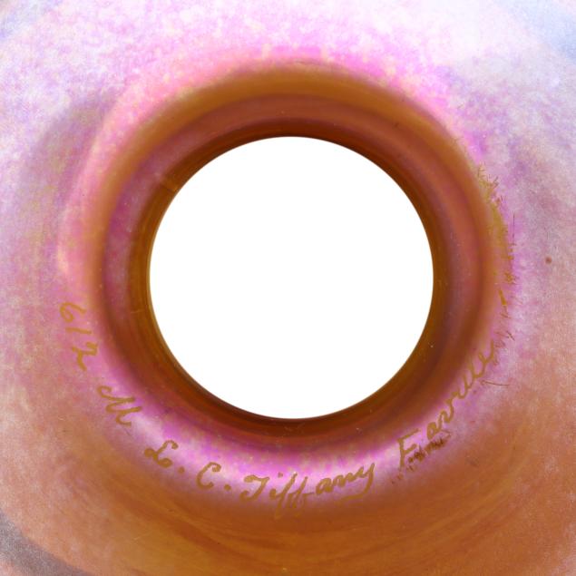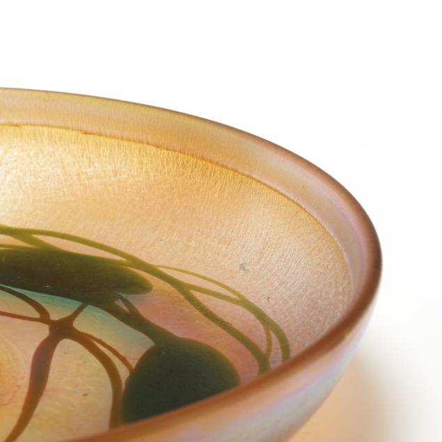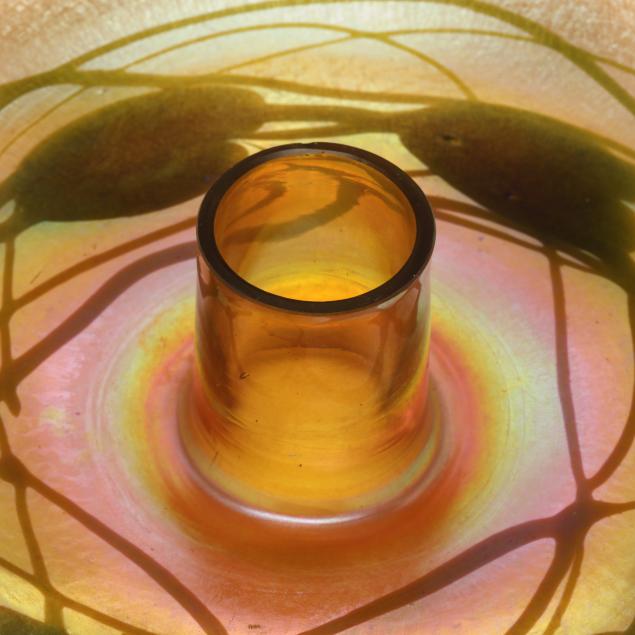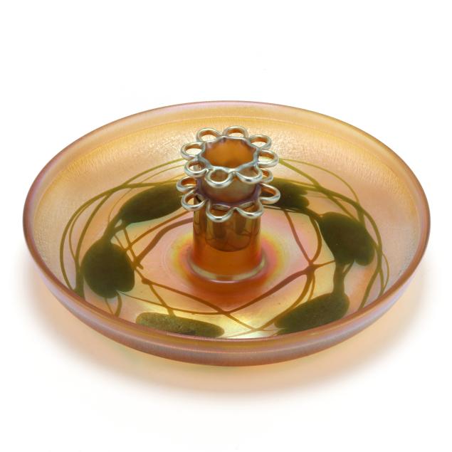 New York, circa 1910, blown golden iridescent glass, the bowl with bright hues or pink, blue and orange, with pulled green leaf and vine motif, curled rim, central flower frog insert in similar hues, both signed, the bowl numbered "612M" and the flower frog "146M".
