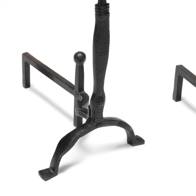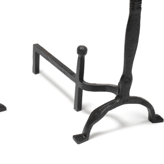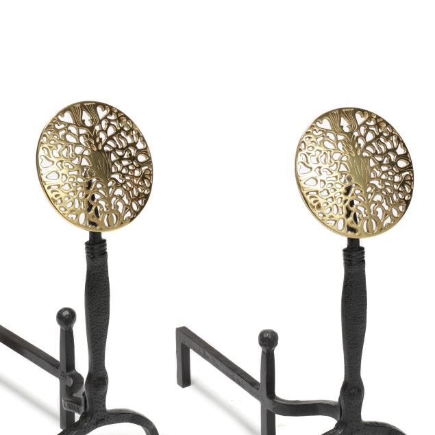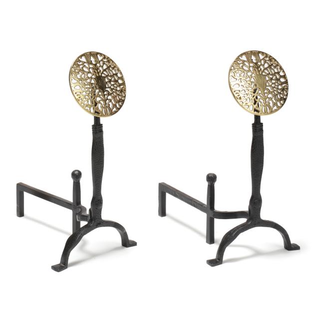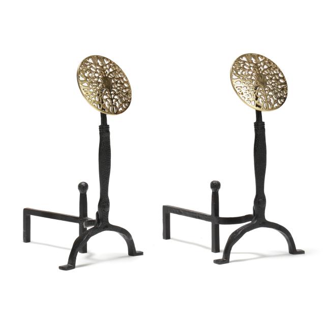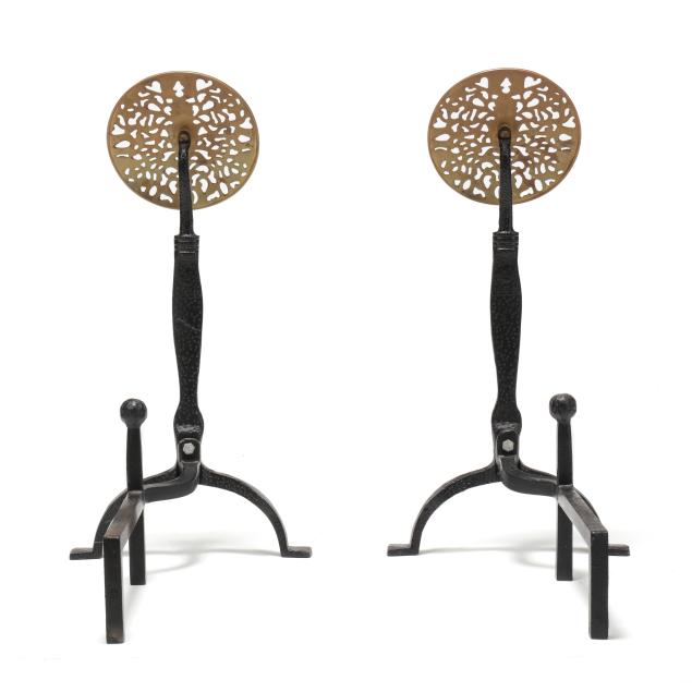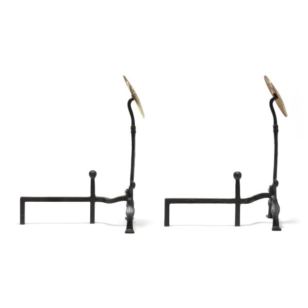 Virginia Metalcrafters, Pair of Dutch Style Brass and Iron Andirons
