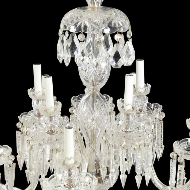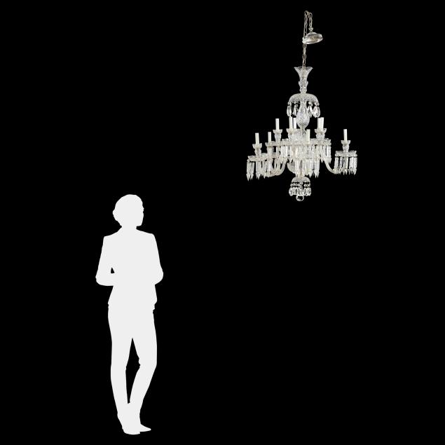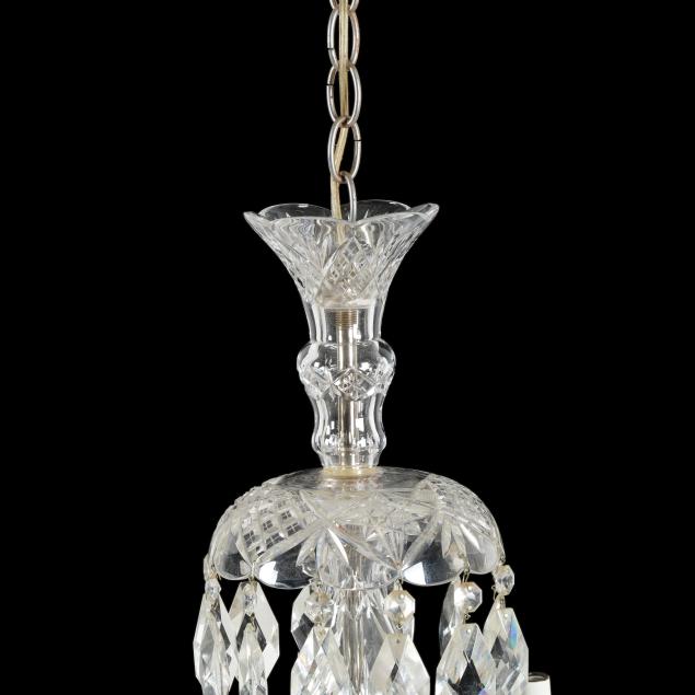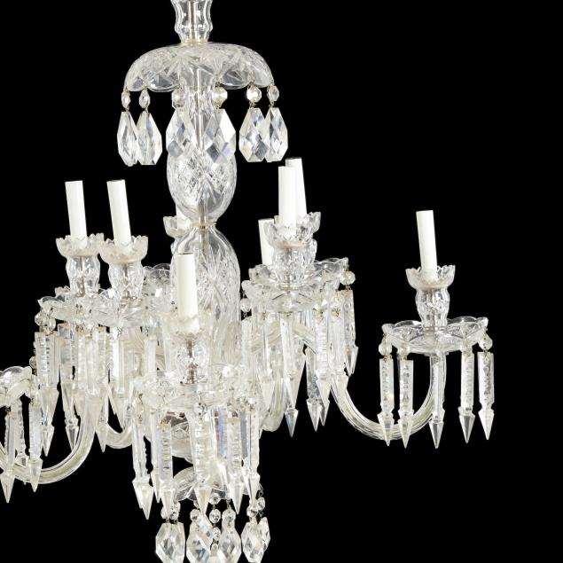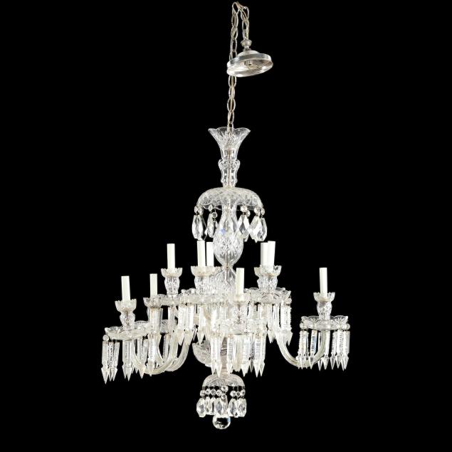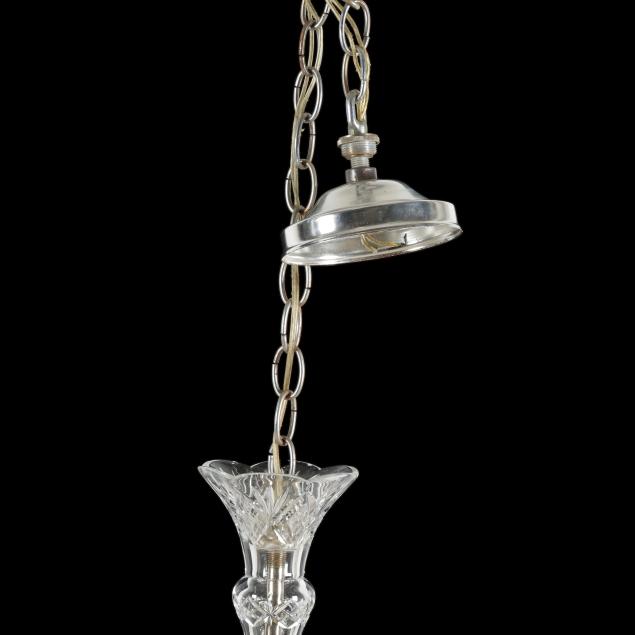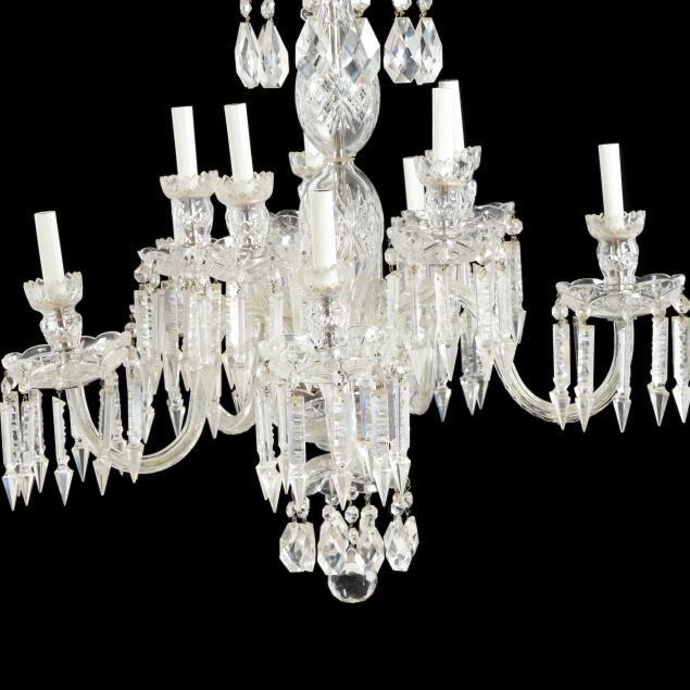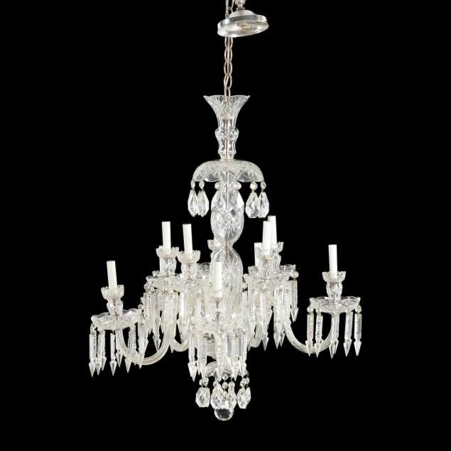 First half 20th century, ten-light form with chrome mounts, wheel cut and polished crystal with various size and pattern drop prisms, with ceiling cap and chain, appears unmarked.
