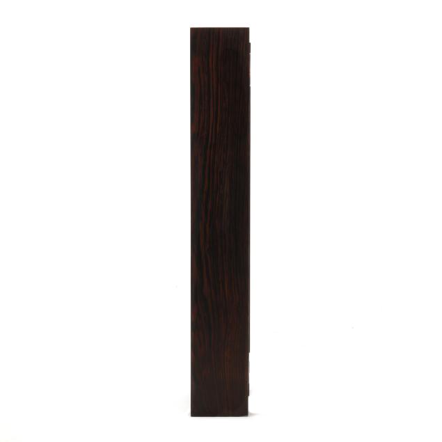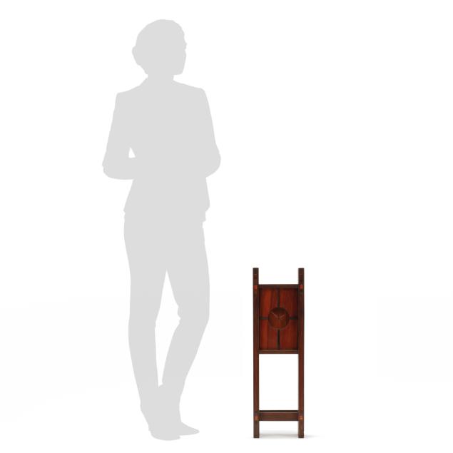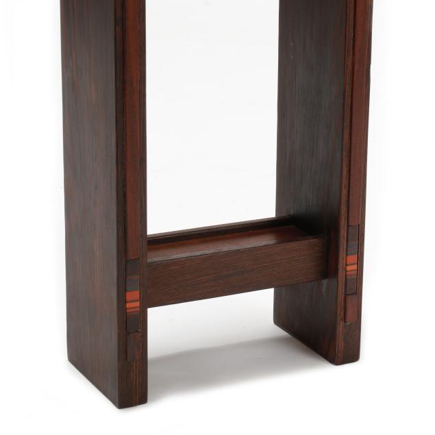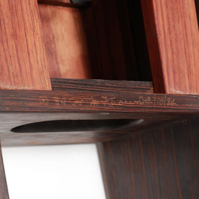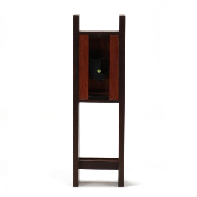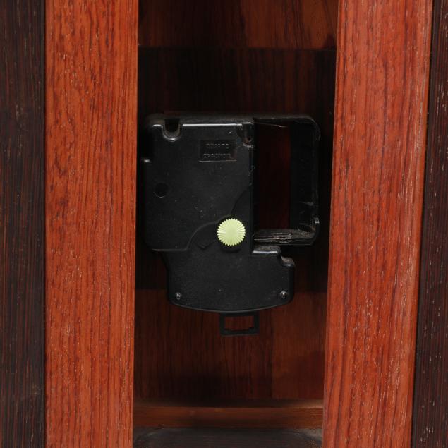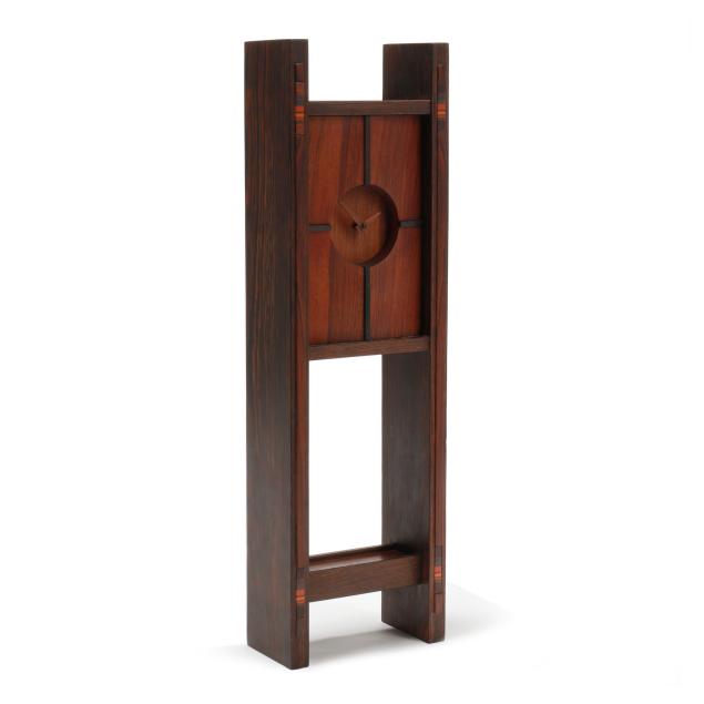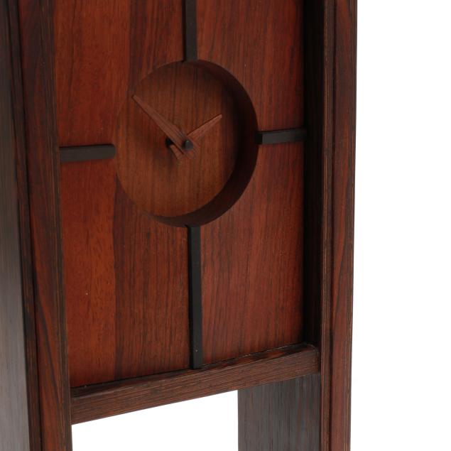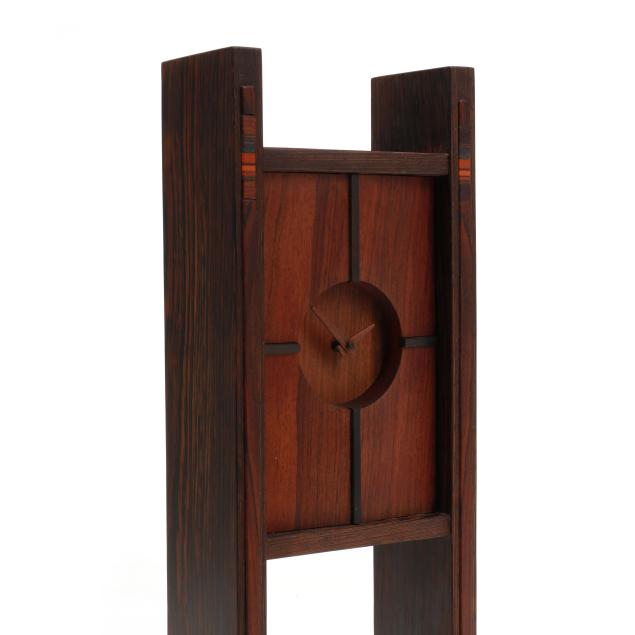 1984, rosewood with multicolor geometric inlays, signed and dated to the reverse, of tall modernist 'H' form with rectangular beveled face centering a round dial with wooden hands, battery operated quartz movement.