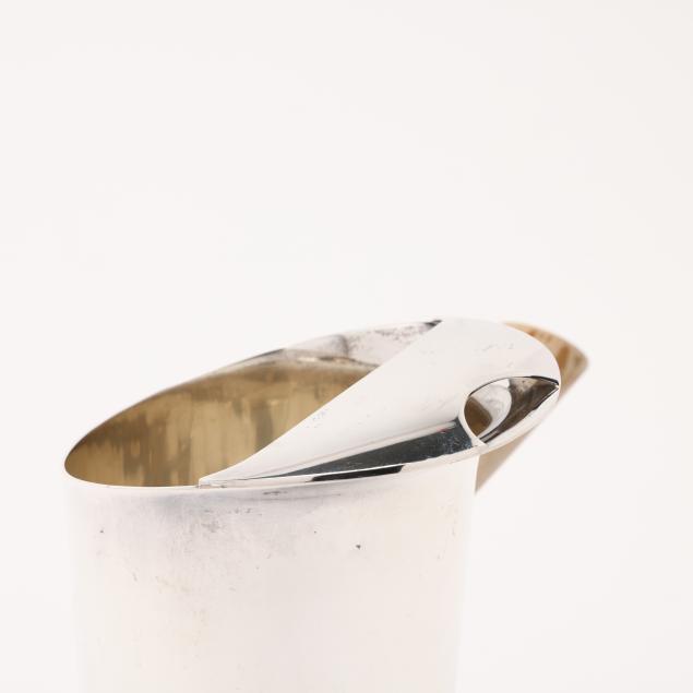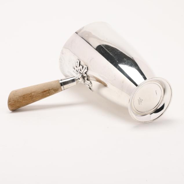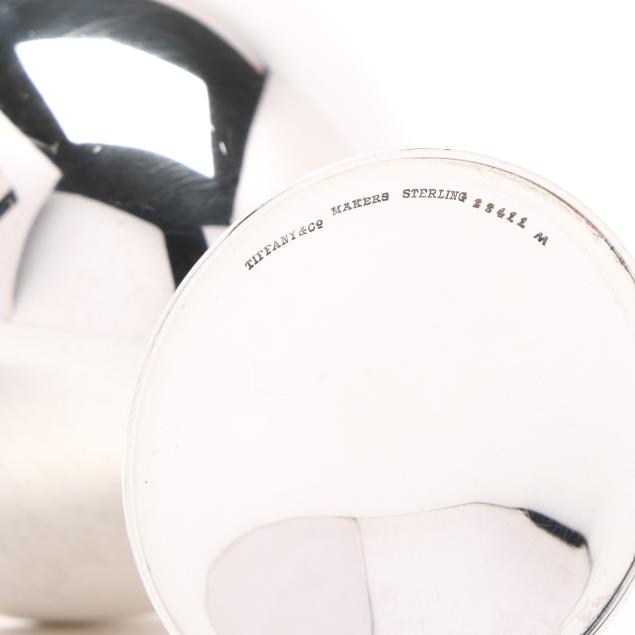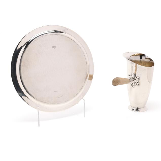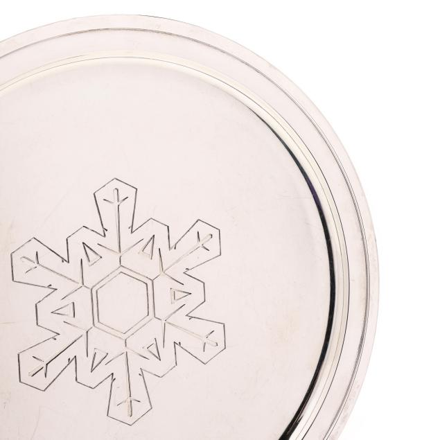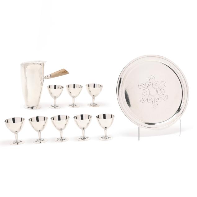 Period mark circa 1947-1956, directorship of Louis deBebian Moore, pattern numbers 23410, 23411, and 23413A; includes a cocktail mixer (8 1/2 in.), (8) cups (3 5/8 in.); and a serving tray (12 1/2 in. dia.); all with a snowflake motif, not monogrammed.