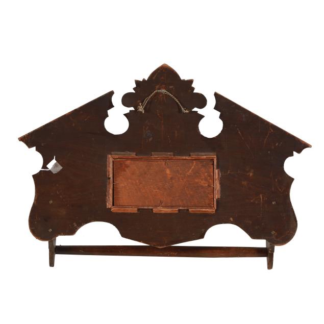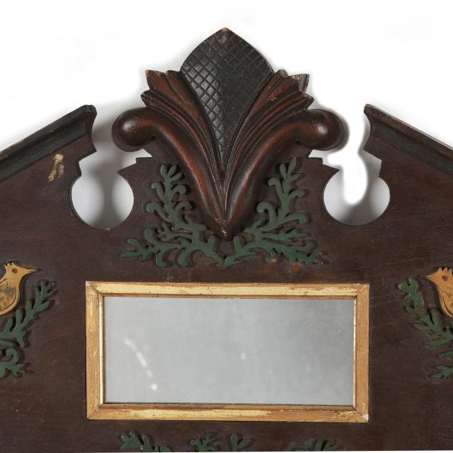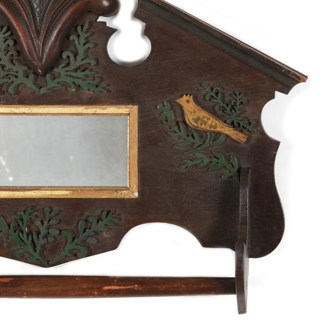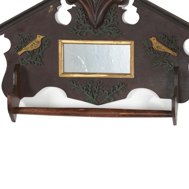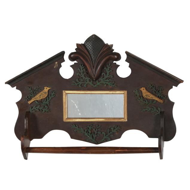 Circa 1900, triangular pediment with central budding ornament, mounted with green polychrome fret carved foliate motifs, gilt birds and central mirrored moldings, above a turned towel rack.