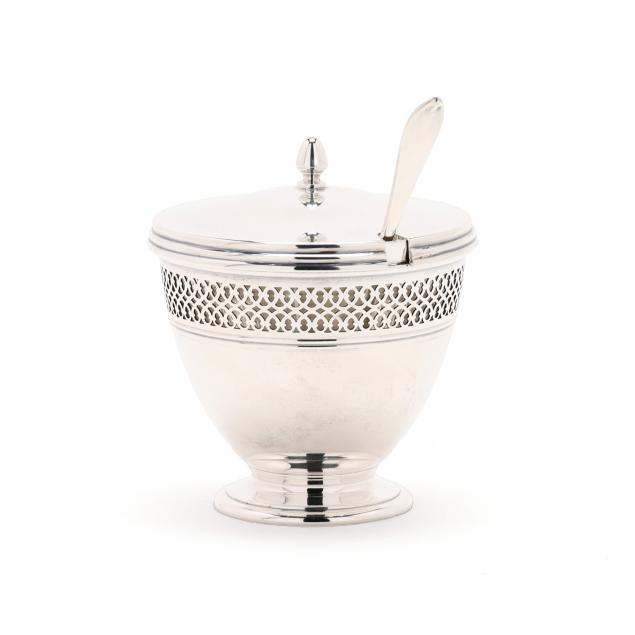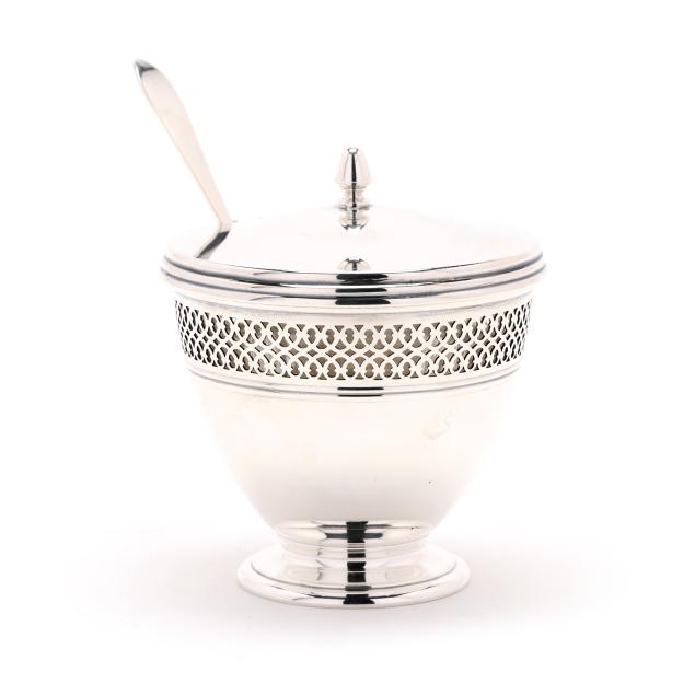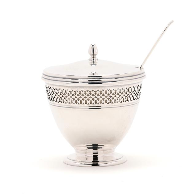 Includes a sugar bowl, period mark of 1907-1947, directorship of John C. Moore II, pattern number 18423, fitted with a glass insert and