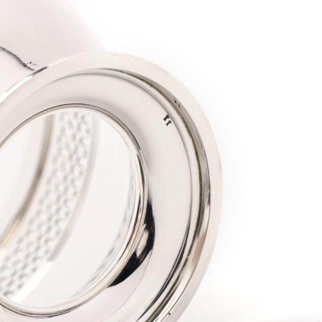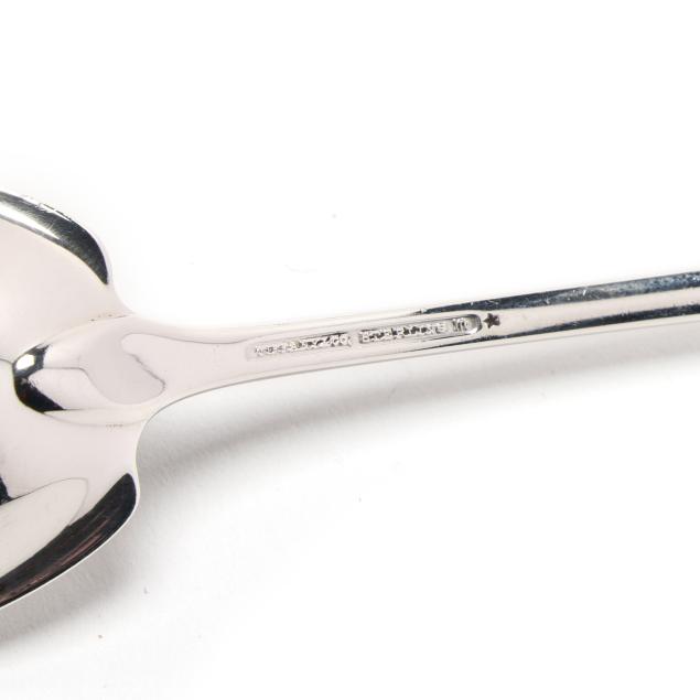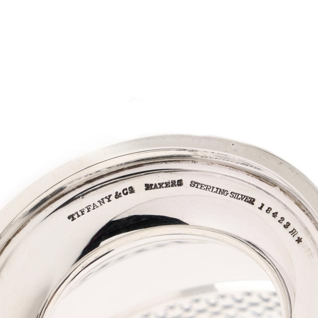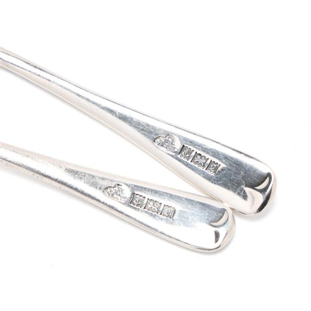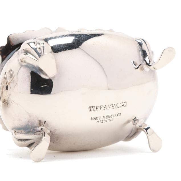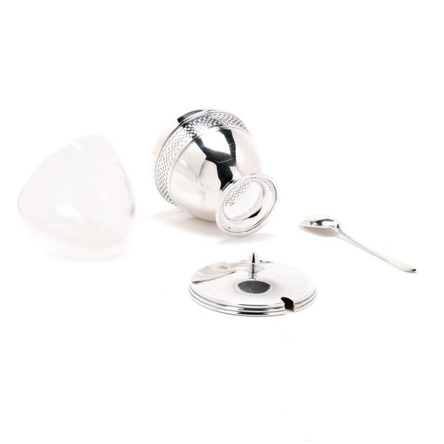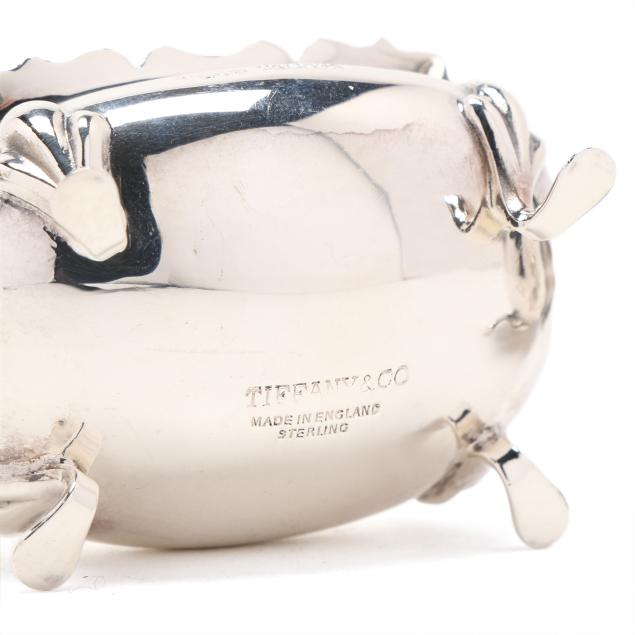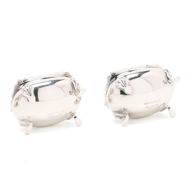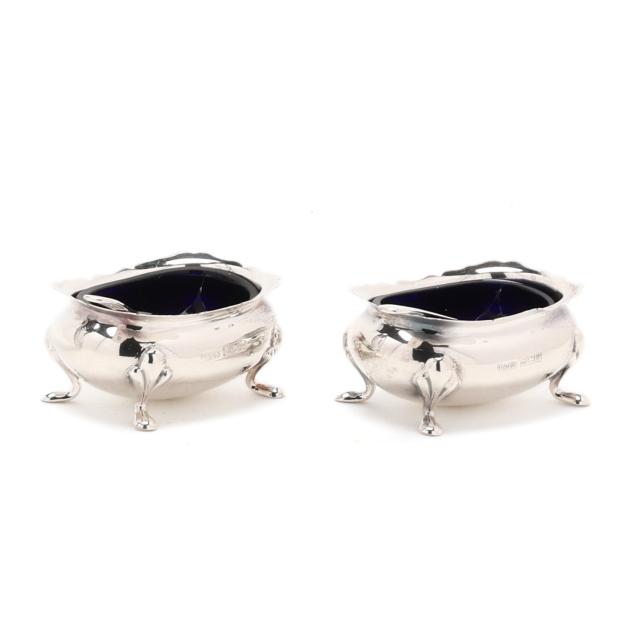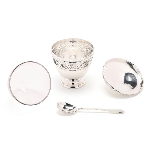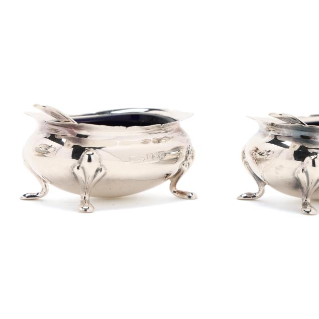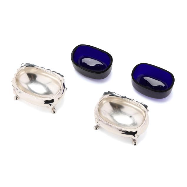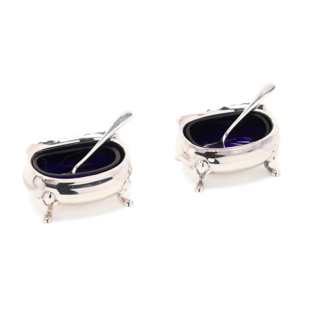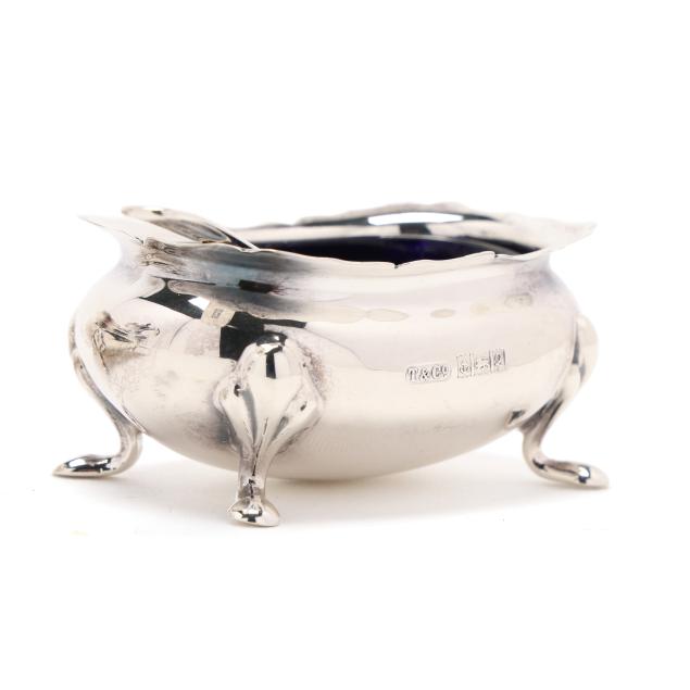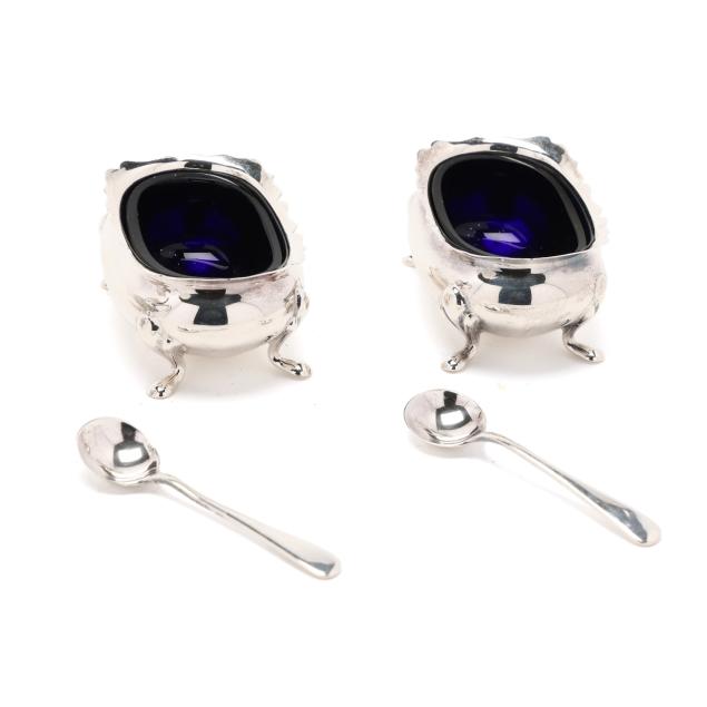 Faneuil sugar spoon; and (2) salt cellars with cobalt liners, English hallmarks of Birmingham (1990), retail marks of Tiffany & Co. to the underside, presented with two salt spoons by Asprey; none monogrammed.