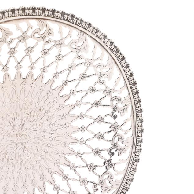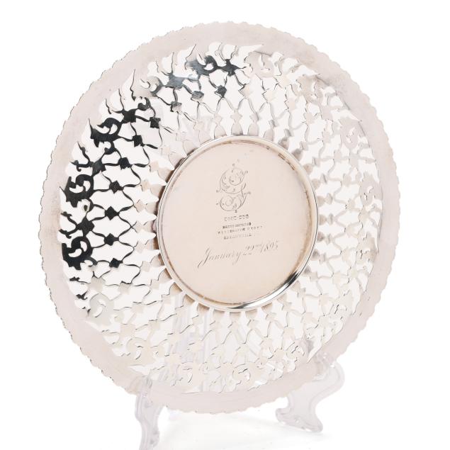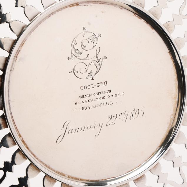 Period mark circa 1892-1902, directorship of Charles L Tiffany, pattern number 13010, the reticulated form with a medallion center, foliate crosshatching, and an acanthus leaf rim, with a stylized "G" monogram and engraved "January, 22nd, 1895" to the underside.