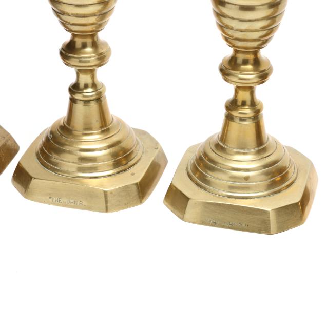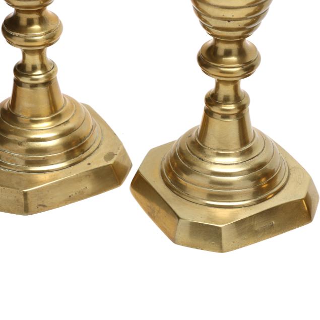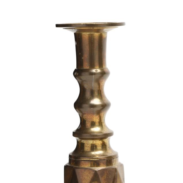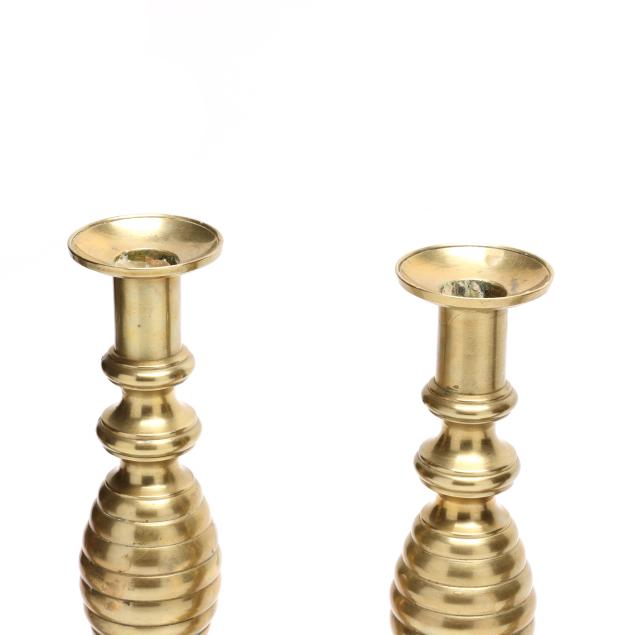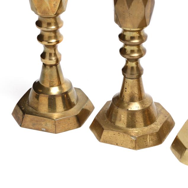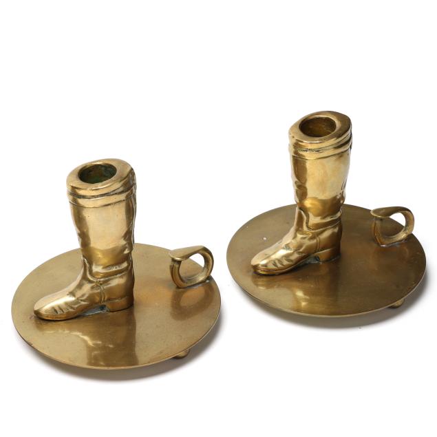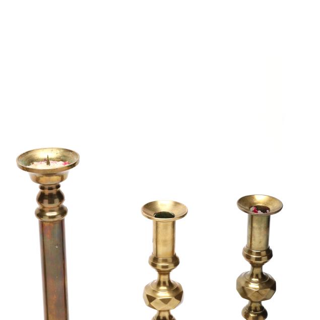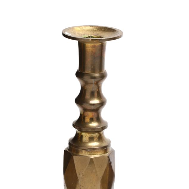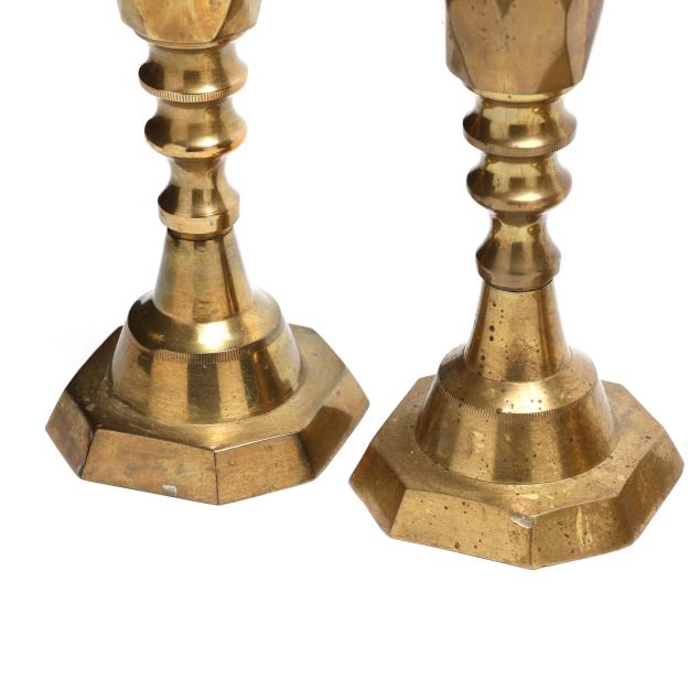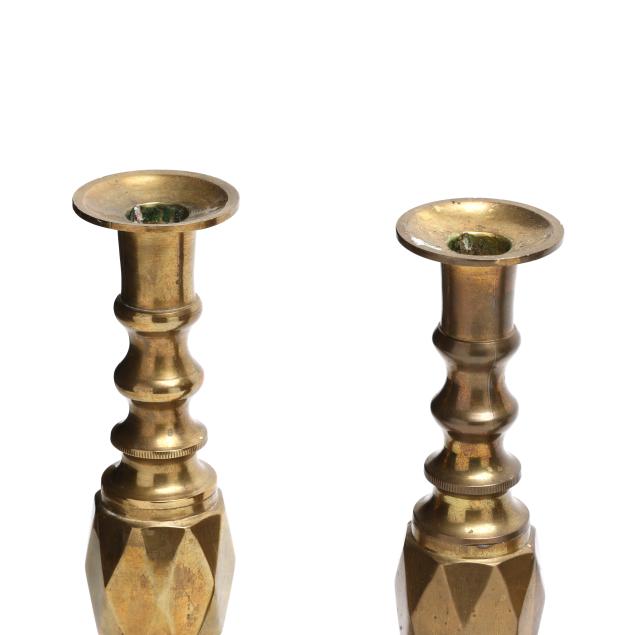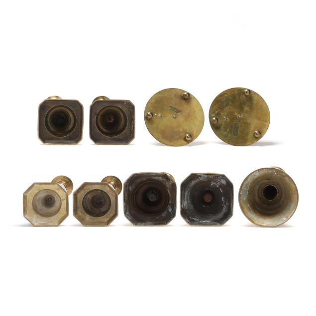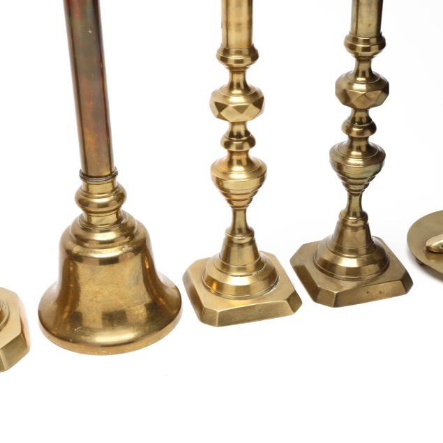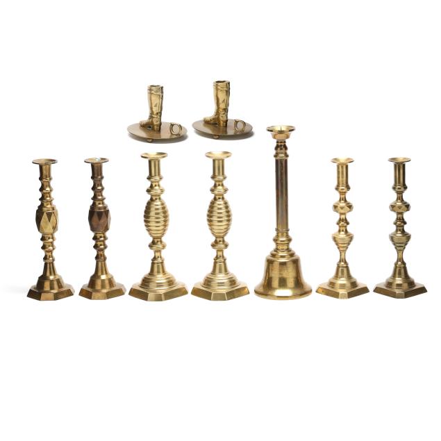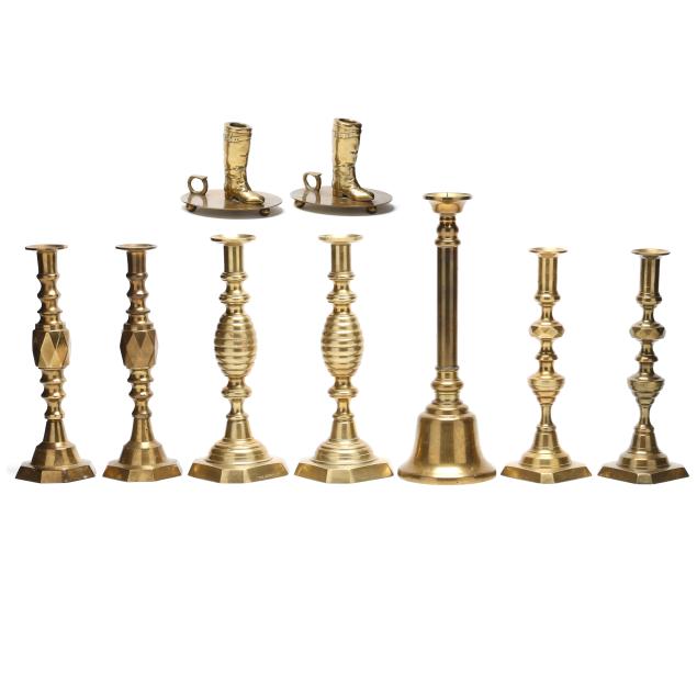 To include (3) pairs of late 19th-early 20th century royal pattern English push-up brass candlesticks, one pair cast in the "JOHN BULL" pattern, registration numbered RD378505 (12 1/2 in.), the other two pairs in diamond and beehive pattern, unmarked, the shorter pair with brazed shaft construction (taller 12 in.); a single columnar candle holder with pricket over a bell base, unmarked (14 3/4 in.); and a pair of vintage boot form chambersticks, unmarked (5 in.).