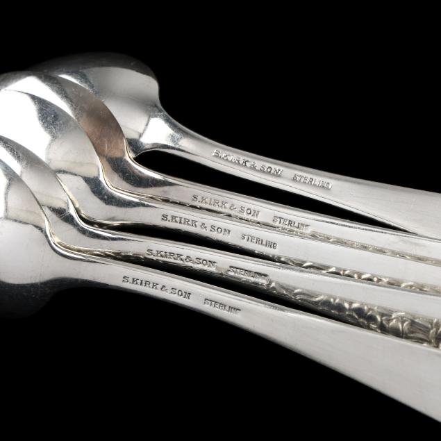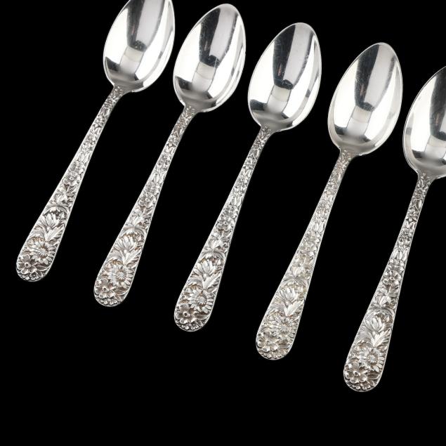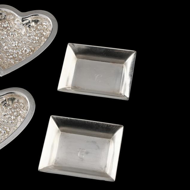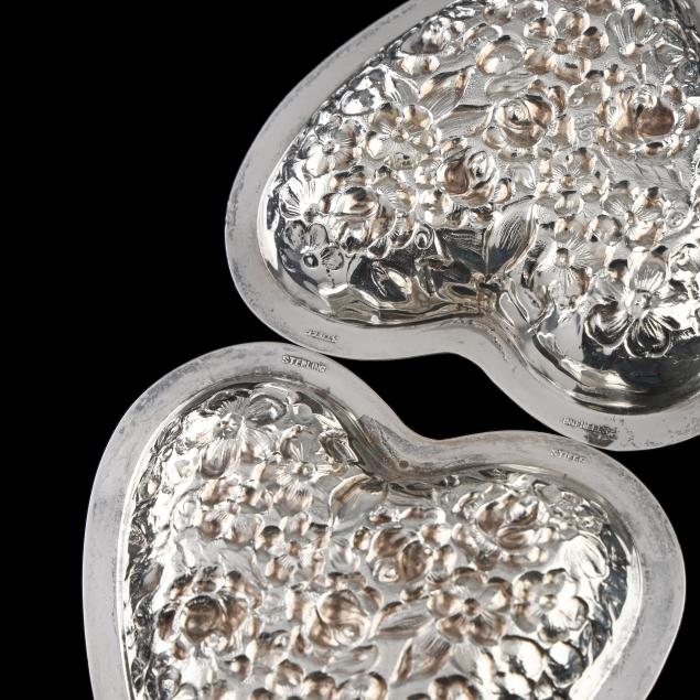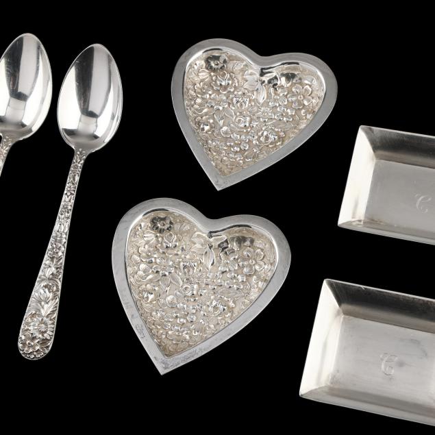 Includes a set of (5) S. Kirk & Sons Repousse teaspoons, not monogrammed; two Stieff Repousse heart form dishes, not monogrammed; and (2) Stieff nut dishes, monogrammed.