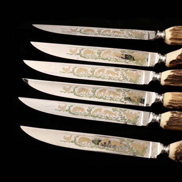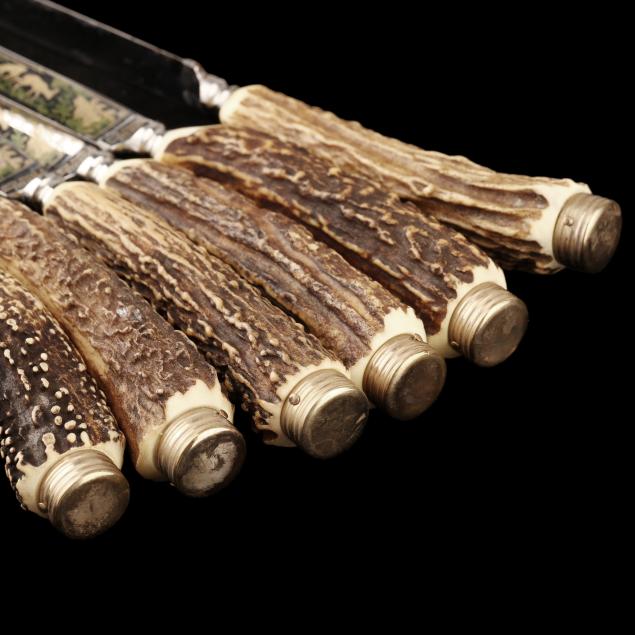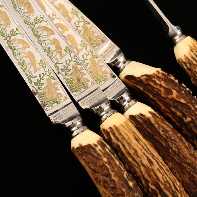 By Anton Wingen Jr., with stained stag handles and enameled hunt scenes to the blades; presented in a fitted retail case for Marshall Field & Company.