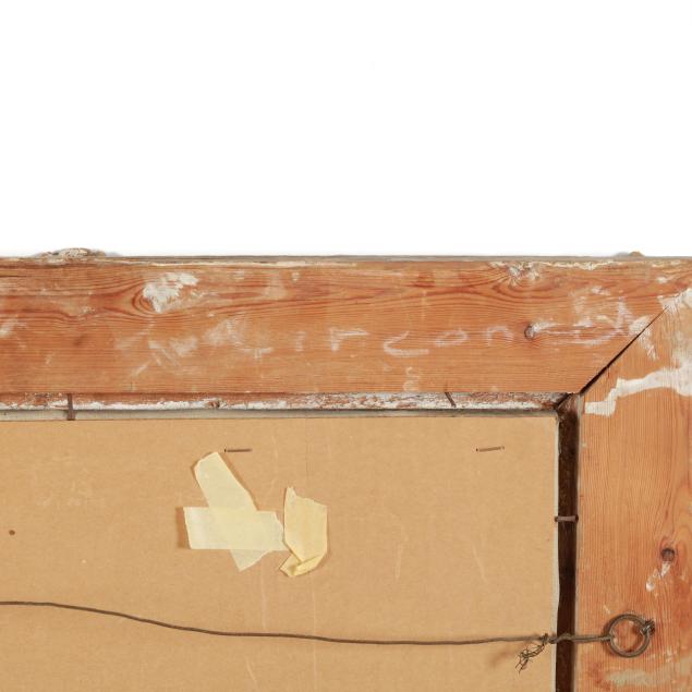 Minor scattered chipping to frame; light water spots along left edge of canvas.