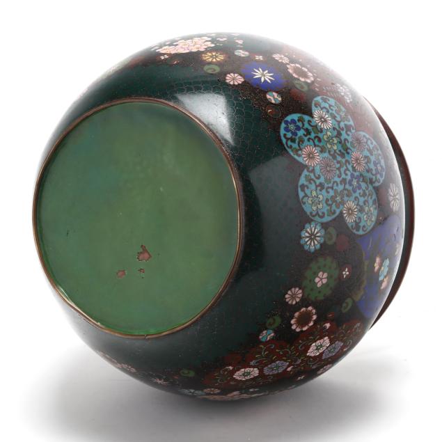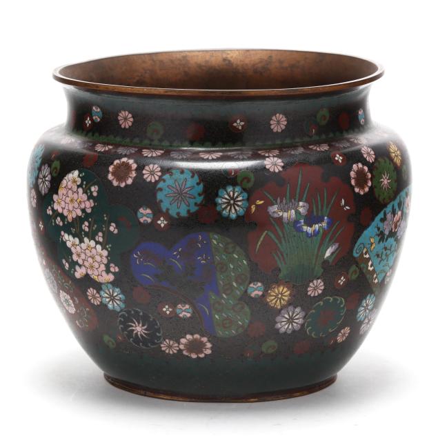Meiji period (1868-1912), a wide mouth cloisonné vessel with brightly colored patterned enamel floral medallions and fans against a black ground, underside with green enamel, unmarked.