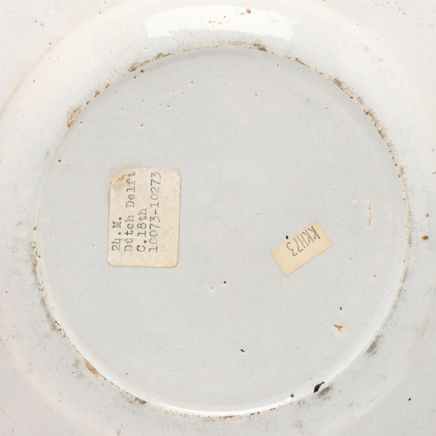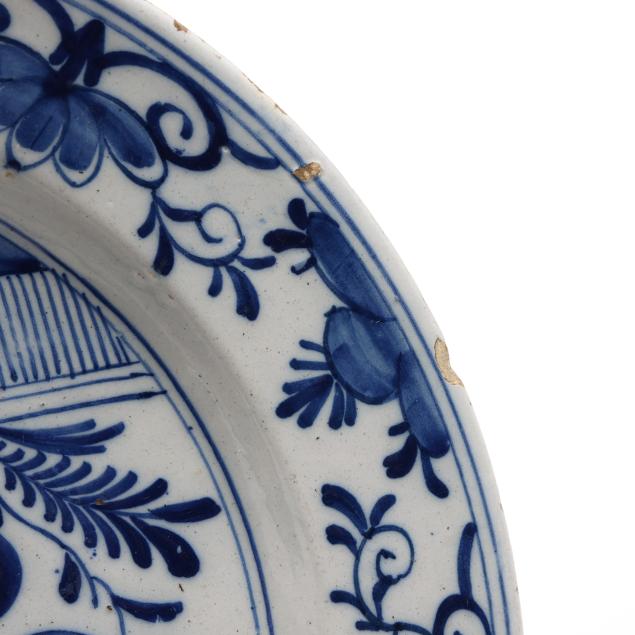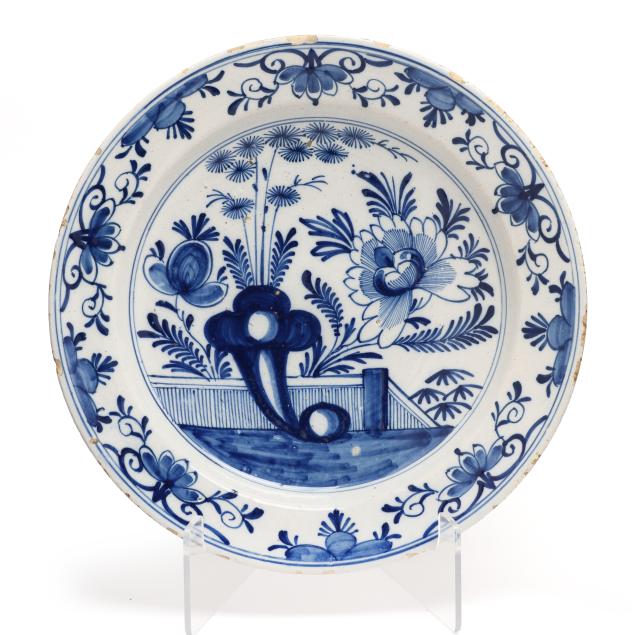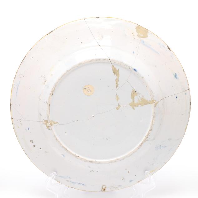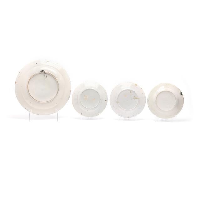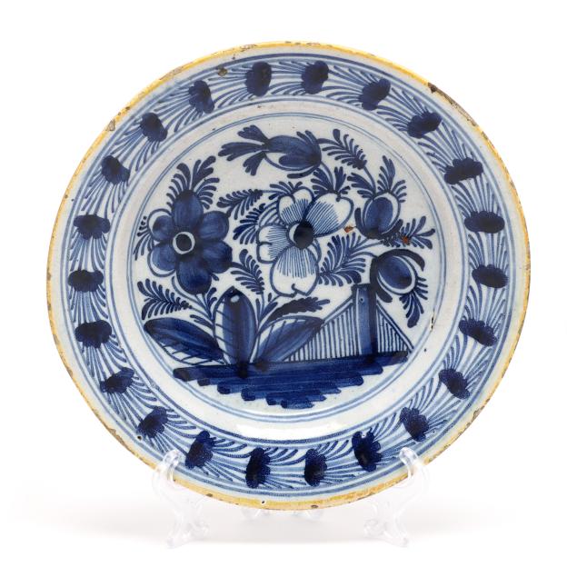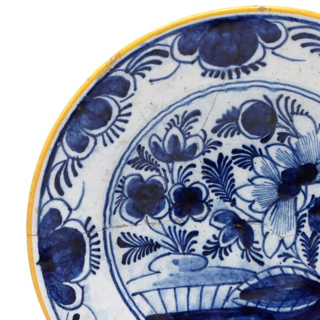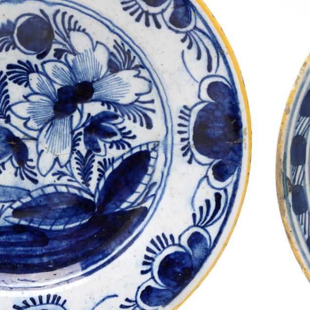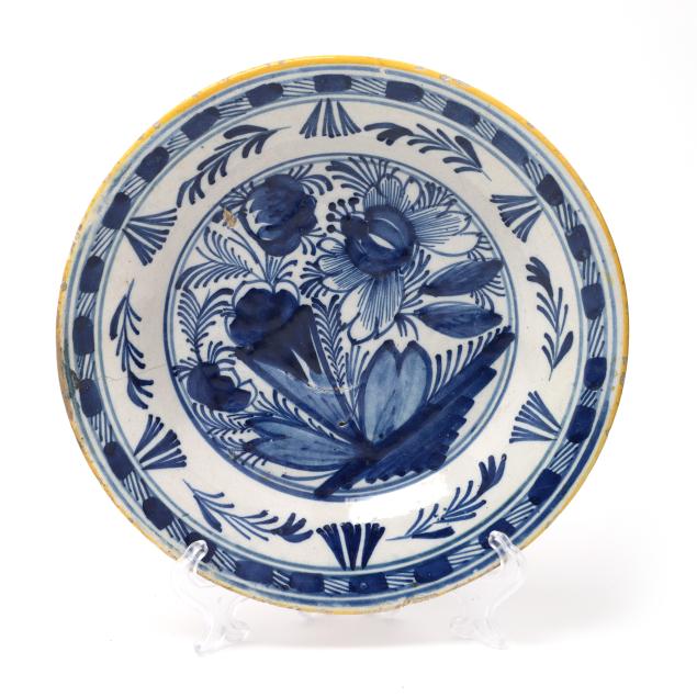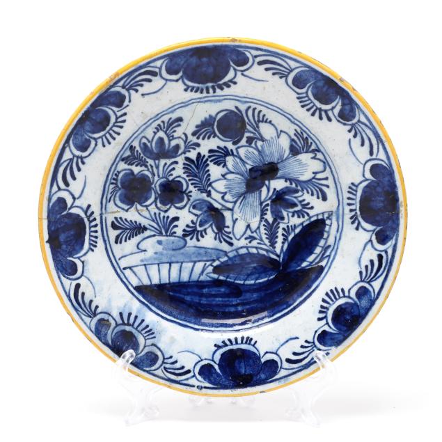 18th century, tin-glazed earthenware with cobalt, unmarked, each hand-painted with central floral and garden motifs within linear and floral patterned borders, including a large charger (14 3/8 in.), and three soup plates with yellow rim edge (9 1/4 in.)
