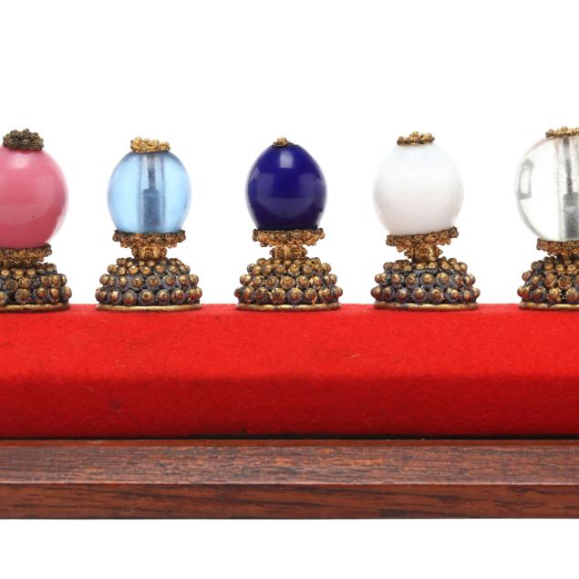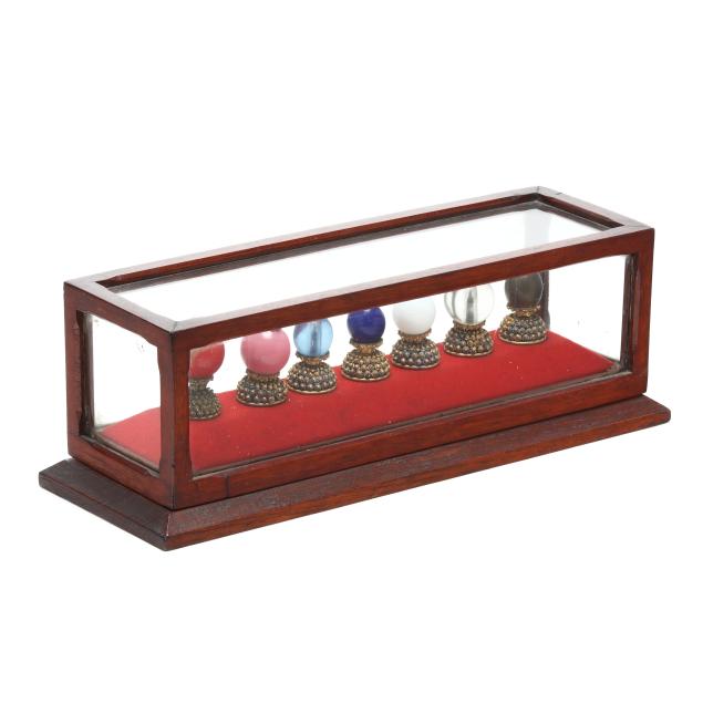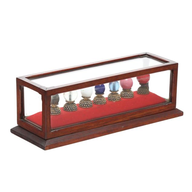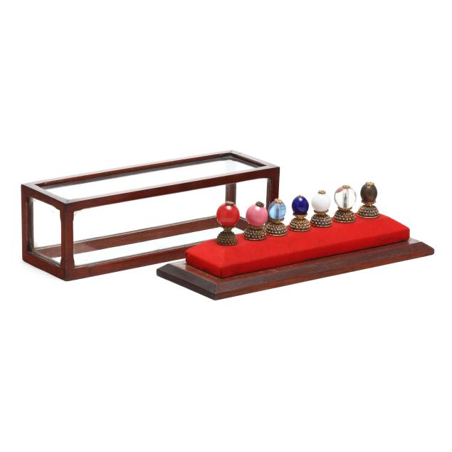 Qing dynasty (1644-1912), a lovely presentation of seven Chinese court hat insignia buttons of varying colors of Peking glass, each with gilt mounts worked as sunburst floral motifs, the collection is beautifully presented over raised red felt in a custom wood and glass display box.