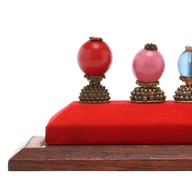 Hat knobs were introduced in 1727. They were worn on hats by China’s Imperial family, nobles and officials. Officials were able to identify the rank of one another by their costume and the color of their hat knobs. There were nine official ranks in total.