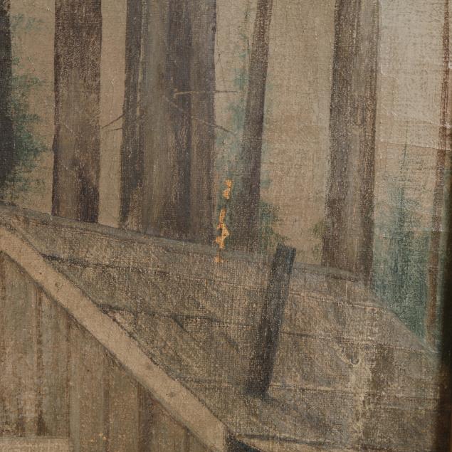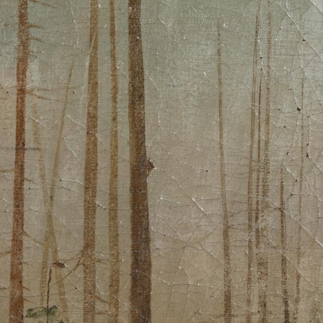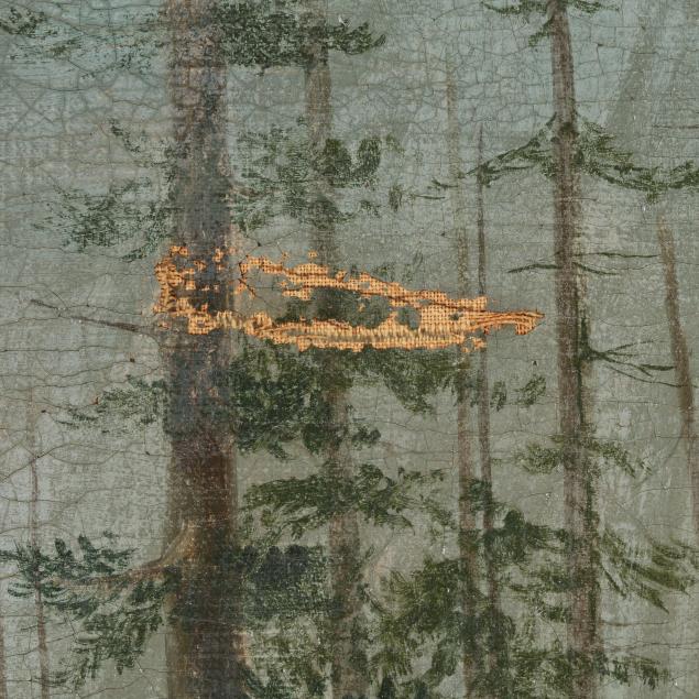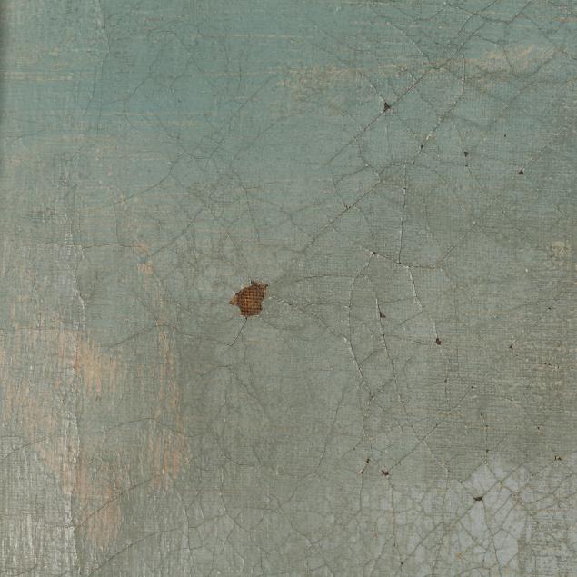Three punctures to canvas, with some associated paint loss; surface grime; allover craquelure; canvas in need of restretching.