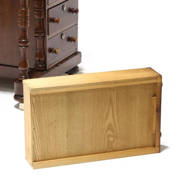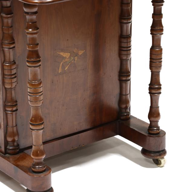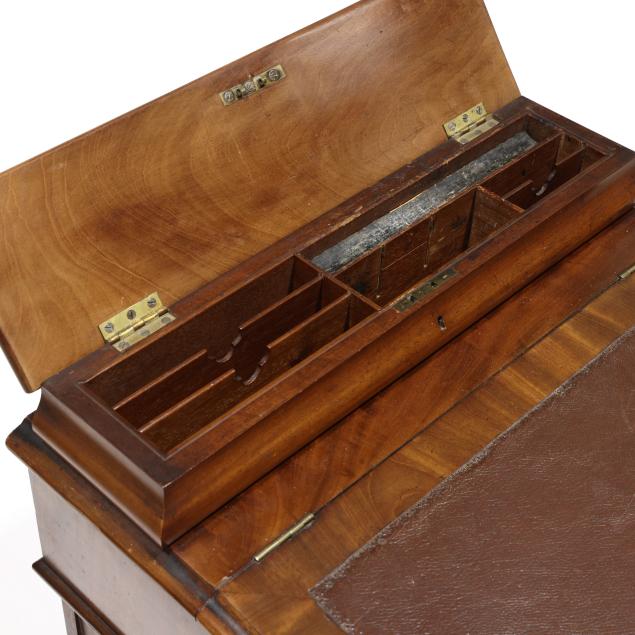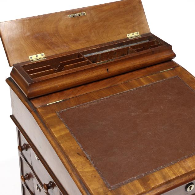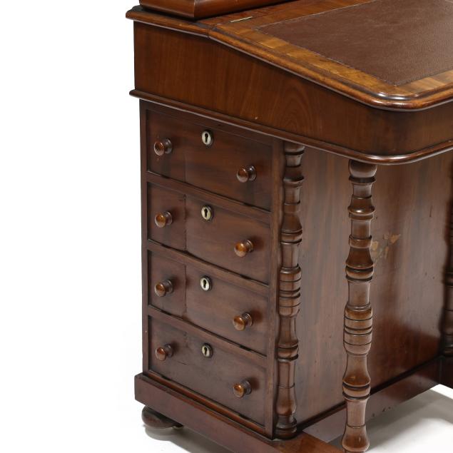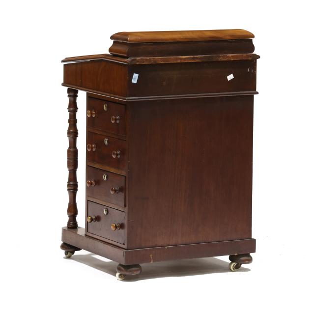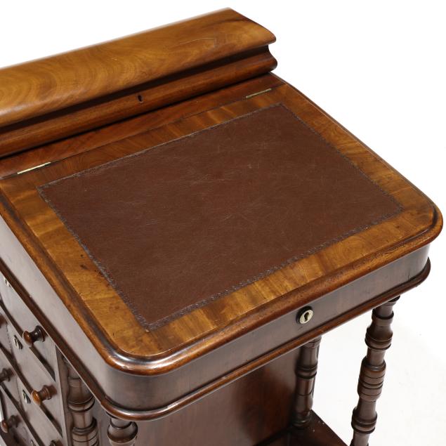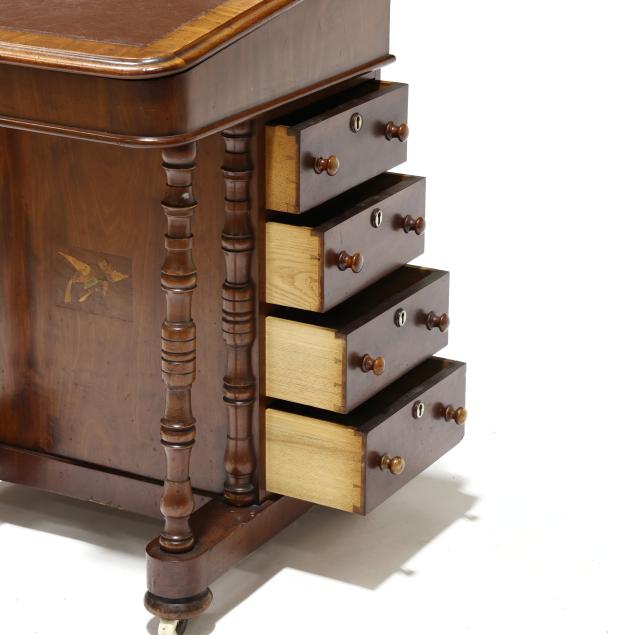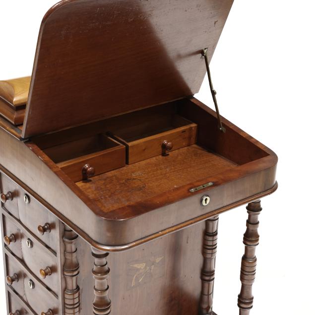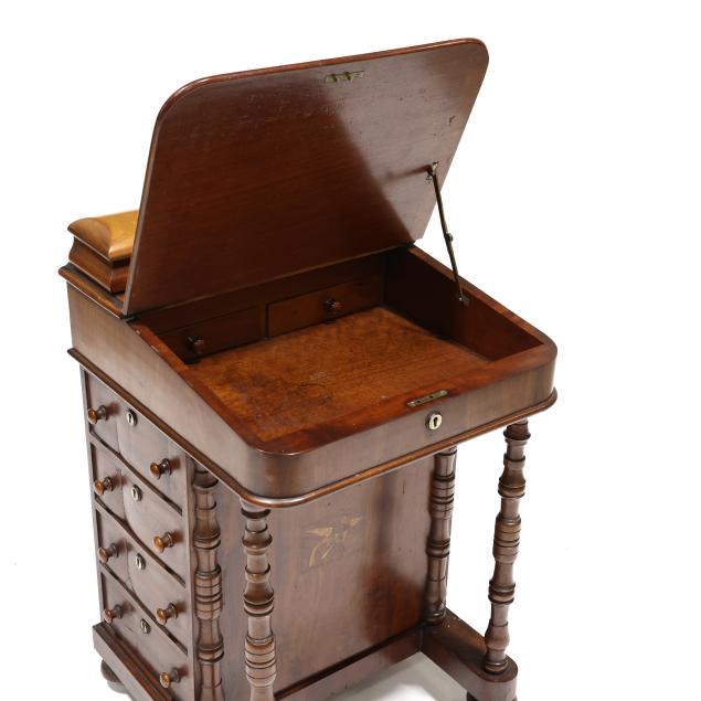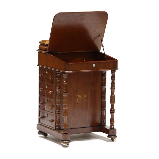 Mid 19th century, mahogany and mixed wood veneers, deal and chestnut secondary, top with recessed hinged lid box opening to reveal divided compartments with hidden pen tray compartment, hinged slanted leather writing surface opens to reveal two small interior drawers, the right side of the case with four drawers, the left side with faux drawers, front turned supports, front panel with inlaid parrot, turned feet on casters, finished on all sides.