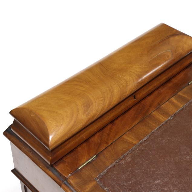 Later leather writing surface; interior rear compartment missing two dividers; no key; left case side with shrinkage cracks.