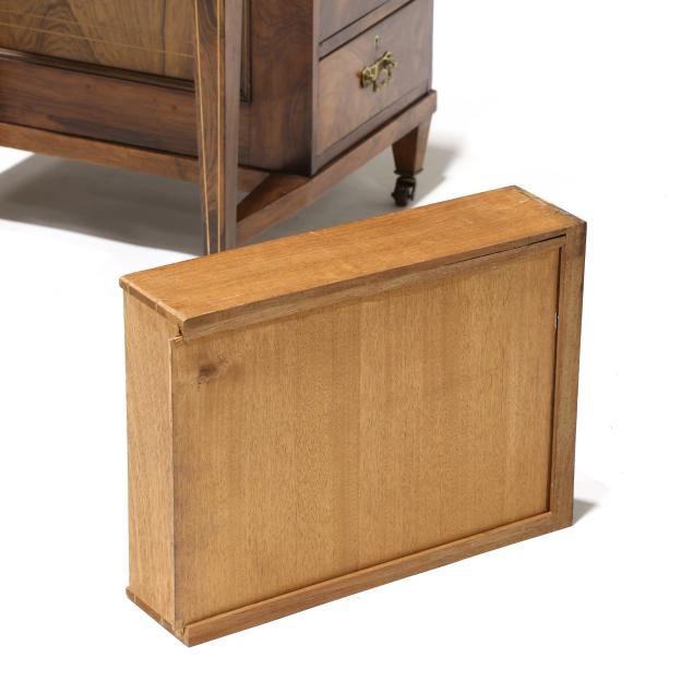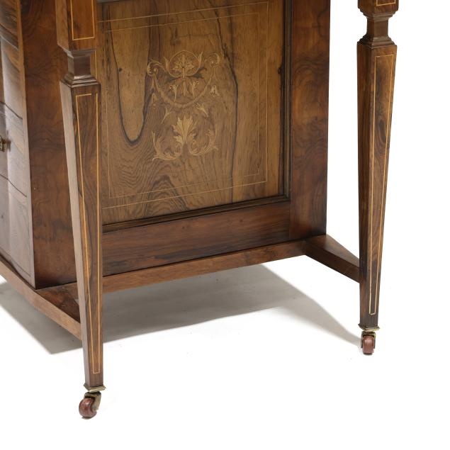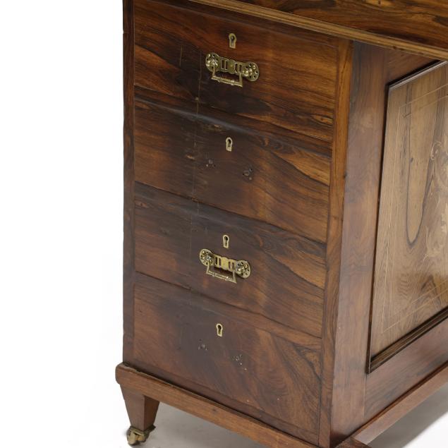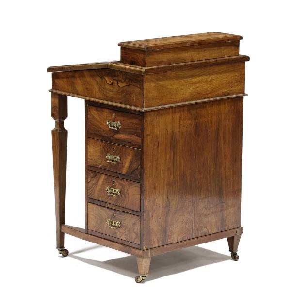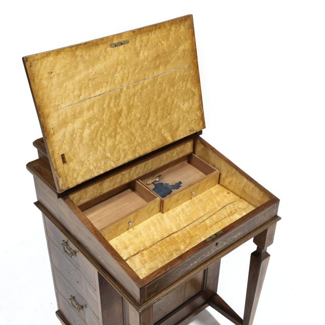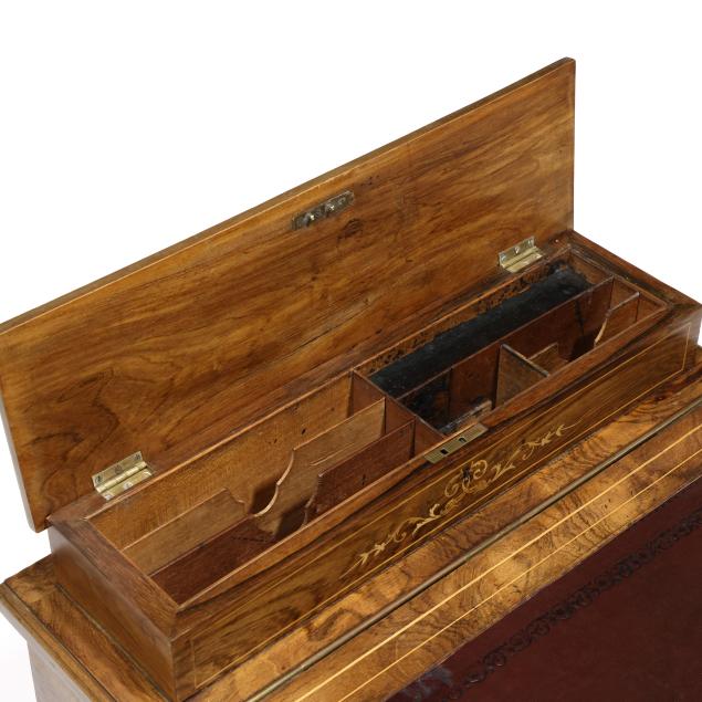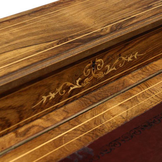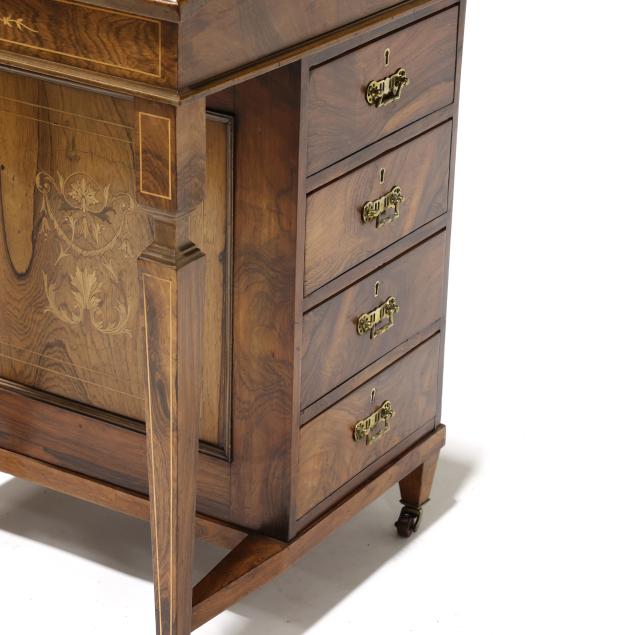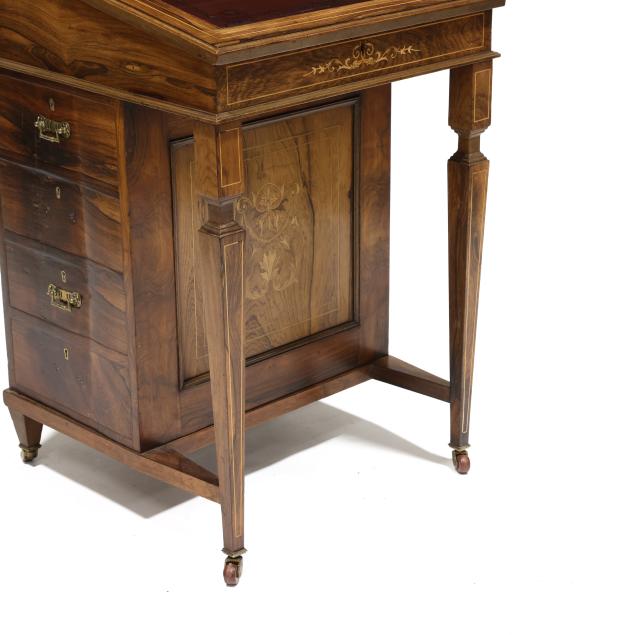 Second half 19th century, rosewood and mixed wood veneers, deal and maple secondary, rear hinged box with divided compartments and hidden pen tray storage, hinged leather writing slant lid, interior finished in birds eye maple with two small fitted drawers, the right side of the case with four flush drawers, the left side with faux drawers, inlaid front panel, tapered legs on casters, finished on all sides.