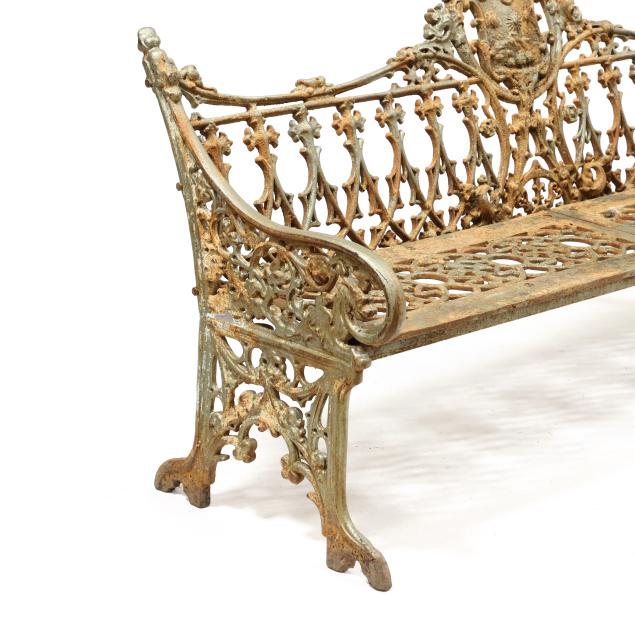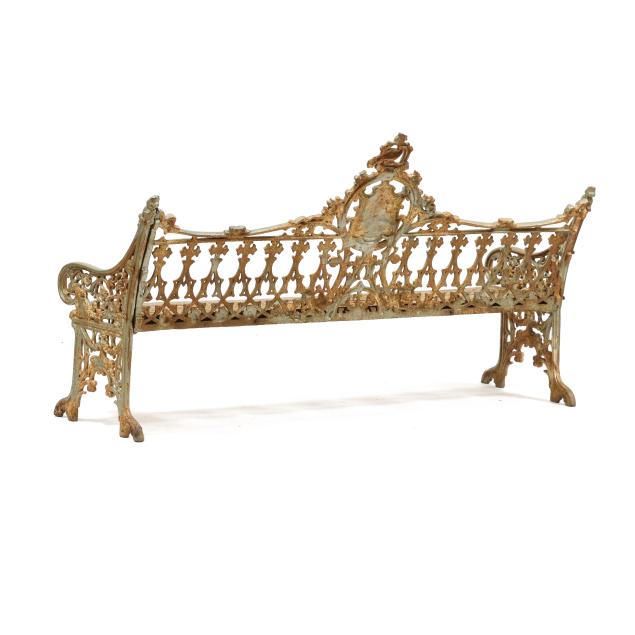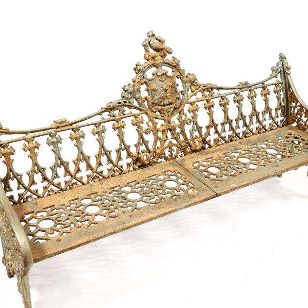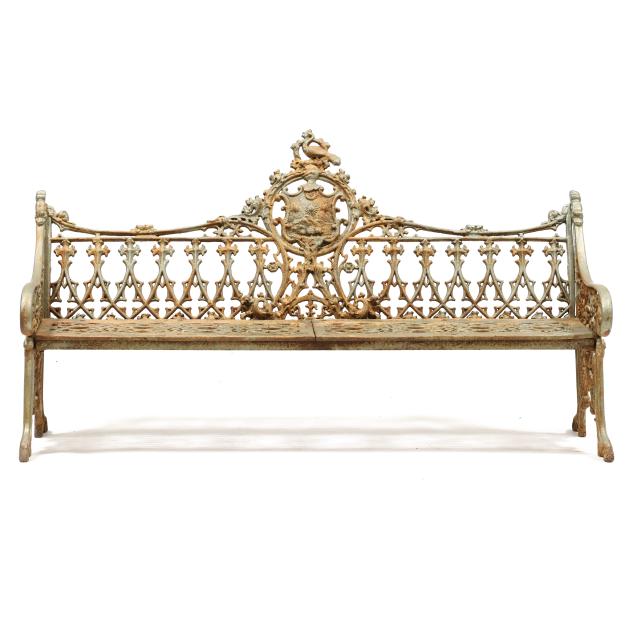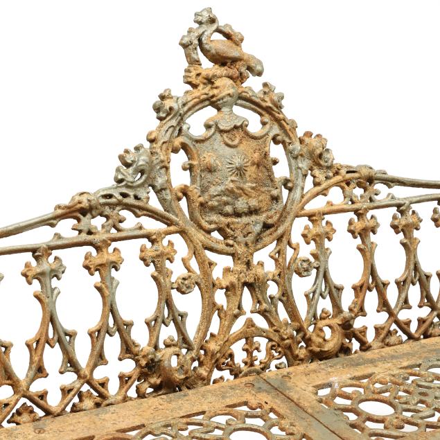 Late 19th / early 20th century, century, the back with coat of arms surmounted by a peacock, quatrefoil pierced panels, reticulated seat, pierced scrolled arms, shaped and molded feet.