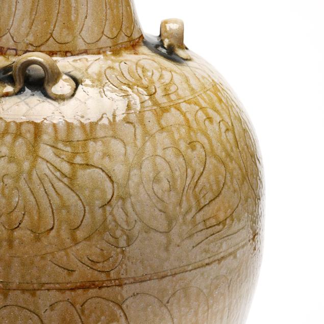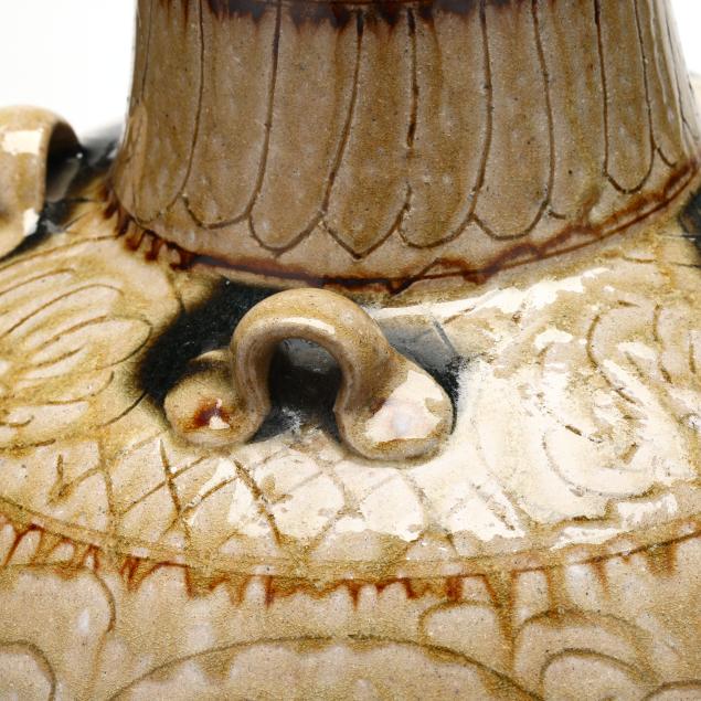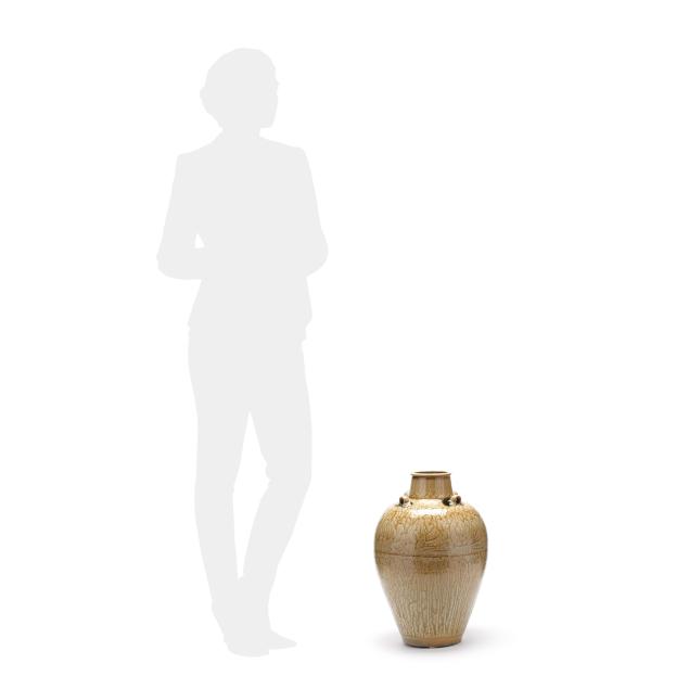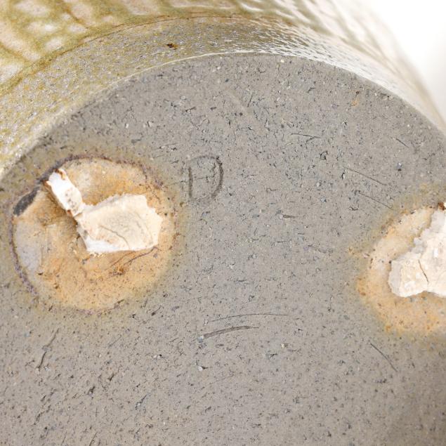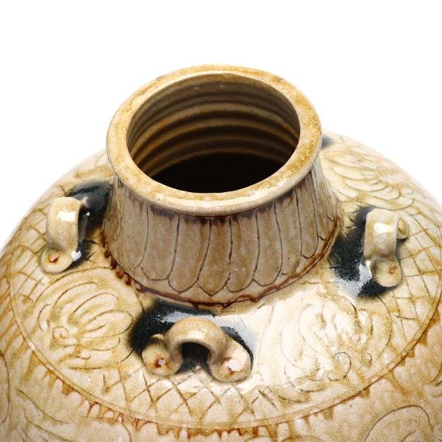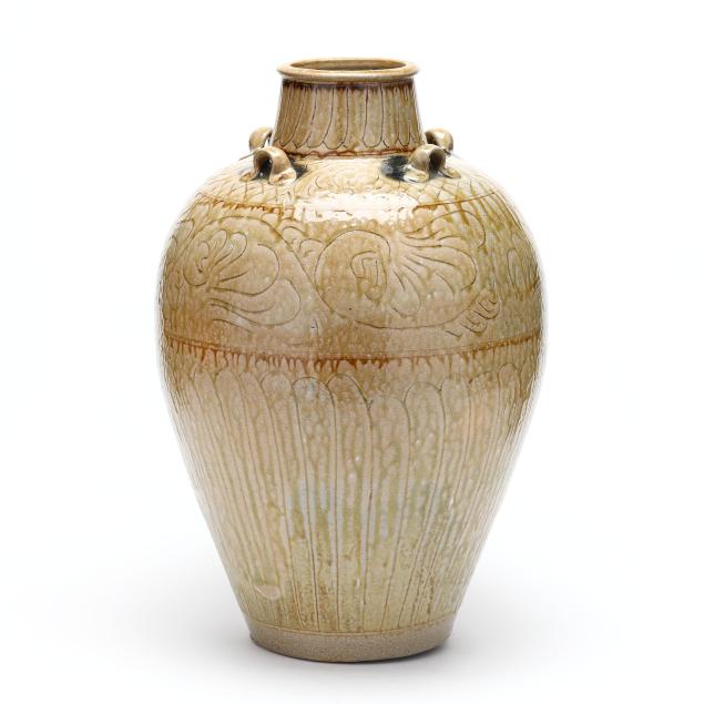 Late 20th-early 21st century, wood fired with salt and ash glaze, incised "D" mark to the underside, tall ovoid jar form with four applied loop handles each with manganese glaze accents, and cylindrical neck, the whole decorated with incised scrolled and lattice linework patterns.