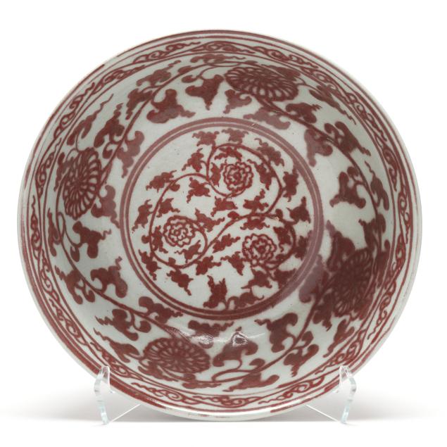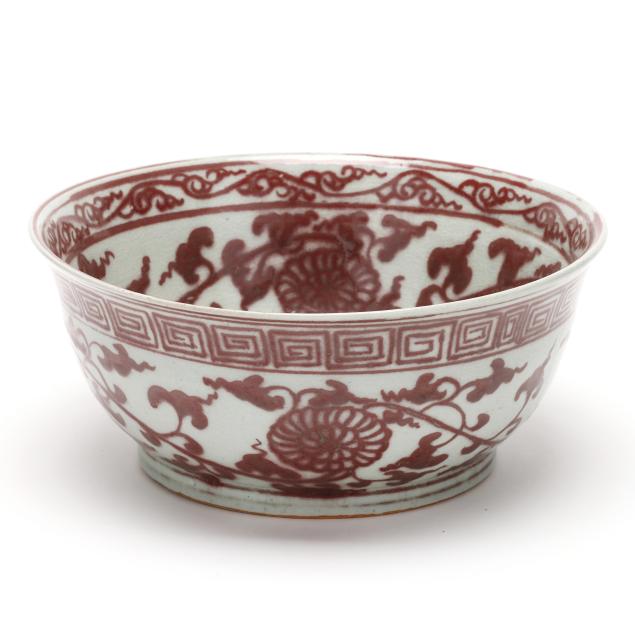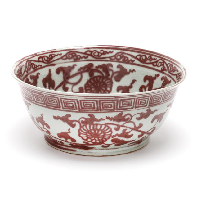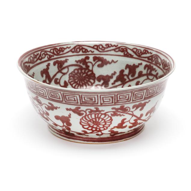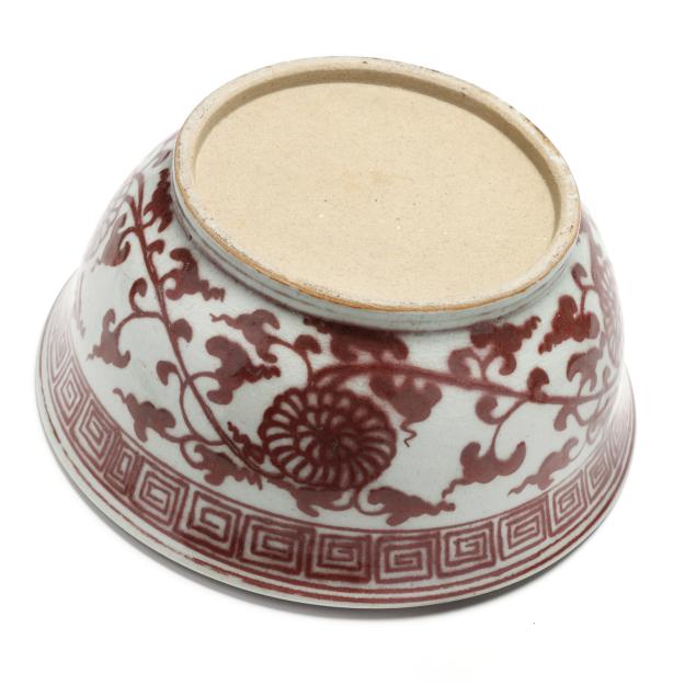 Late 20th century, a porcelain bowl with copper red iron decoration of large flora and scrolling tendrils, the exterior rim with key border, unglazed to underside.