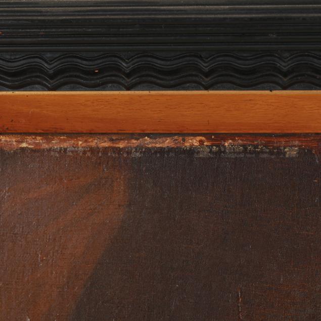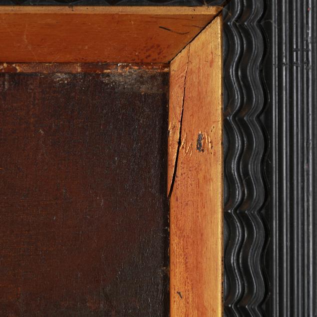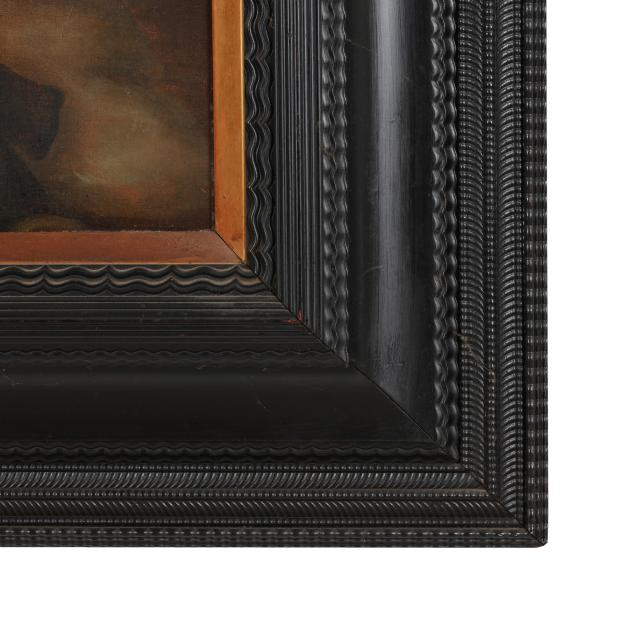 Oil on canvas, unsigned, likely 18th century, presented in an antique ebonized Dutch ripple molding frame with inner gilt liner.