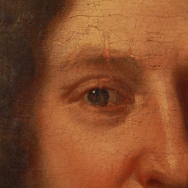 Yellowing to varnish; wear and rubbing to wrapped edge of canvas; heavy masking varnish visible under UV light with a few small spot touchups above sitter's head.