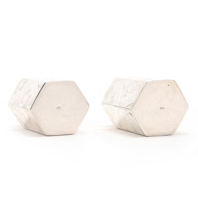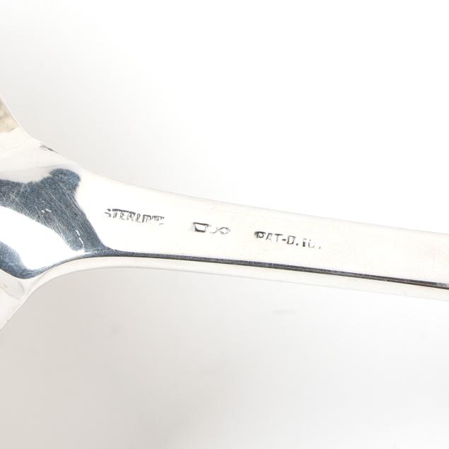 Includes a pair with mark of Reed & Barton, pattern number 560 (3 1/2 in.); a pair with marked "925", hexagonal form with engraving to the exterior (2 1/4 in.); and a Dominick & Haff Queen Anne punch ladle (12 in.); none monogrammed.