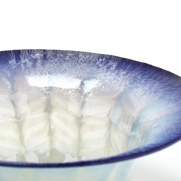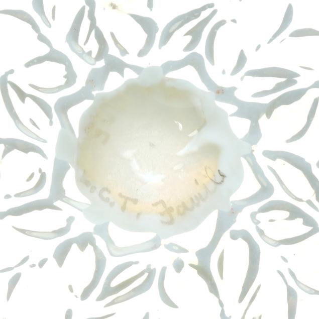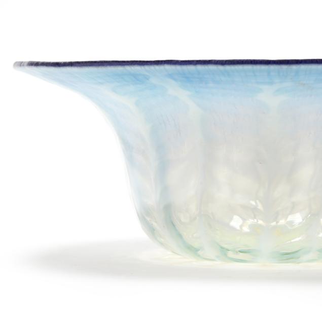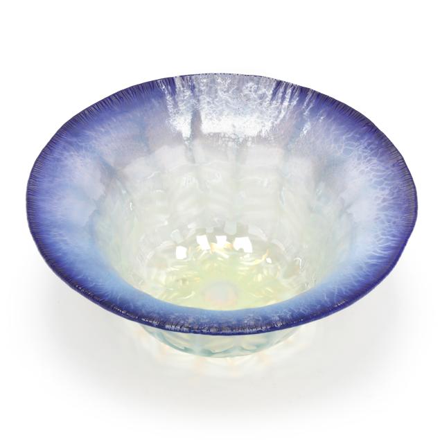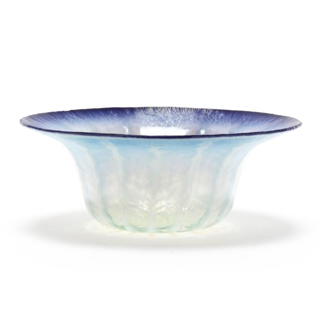 Circa 1915, blown opalescent glass with violet rim, iridescent crazed surface with pulled feather motif, polished pontil, signed and numbered 1925.