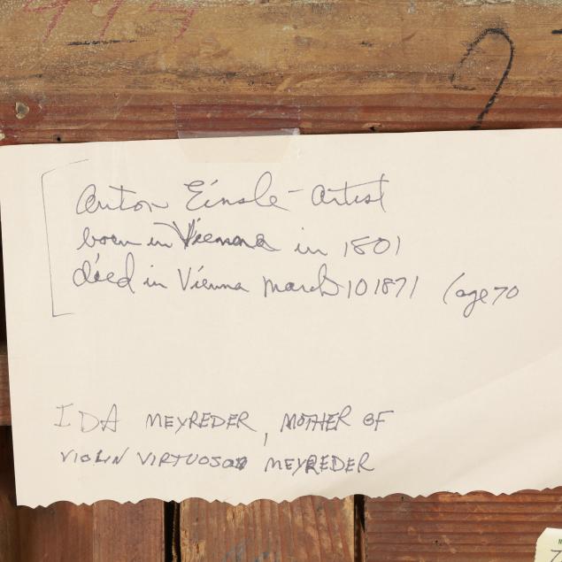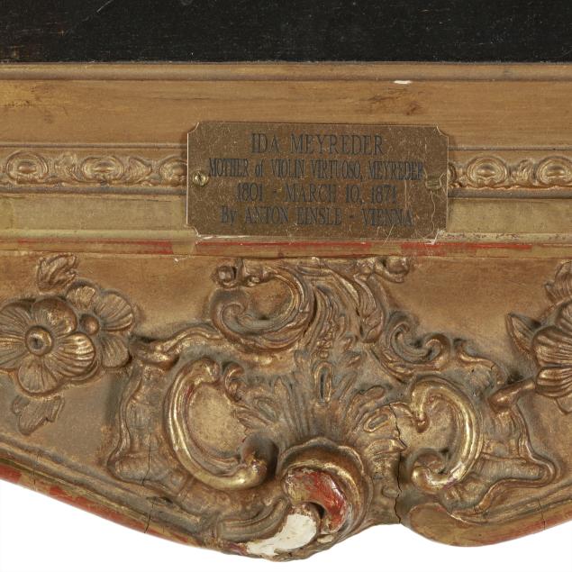 Anton Einsle was an Austrian painter known for his portraits of aristocratic and imperial sitters in mid-19th-century Vienna. Born in Vienna, he studied at the Academy of Fine Arts and later became one of the favored portraitists of the Austrian imperial family, painting members of the House of Habsburg as well as leading figures of political, military, and cultural life. His style is marked by its clarity, careful rendering of facial features, and subtle psychological presence. In this portrait, Einsle depicts the Ida Meyreder, the mother of a professional violinist, with subtle details that convey her social status and persona.