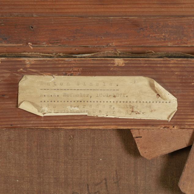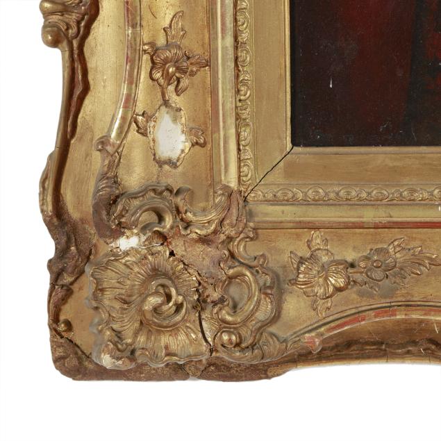 Minor patches to the verso; areas of retouch visible under UV light; "Ein" of signature has been strengthened when viewed under UV light; loss and chipping to frame; some yellowing to varnish.