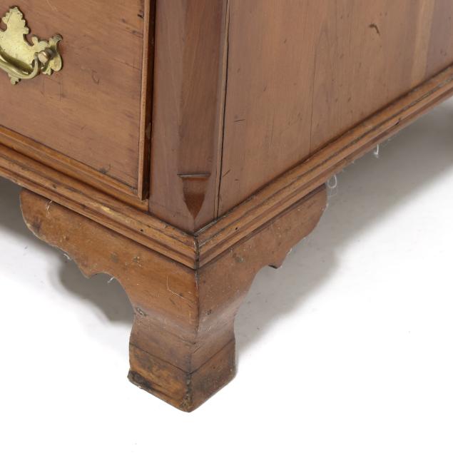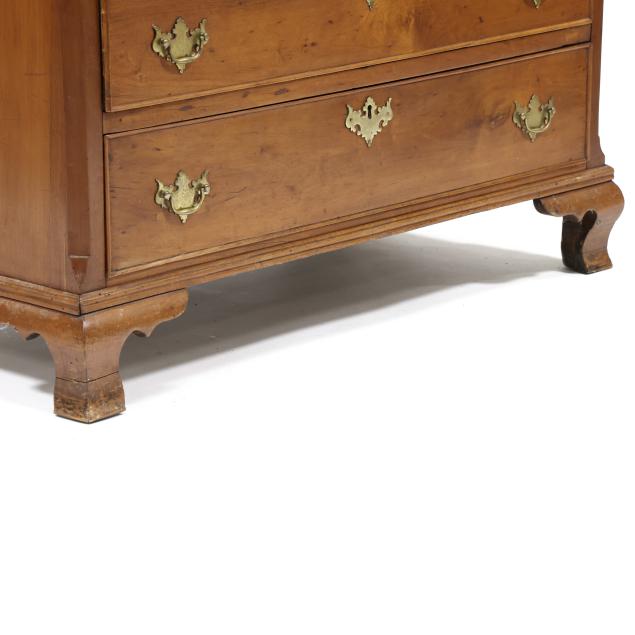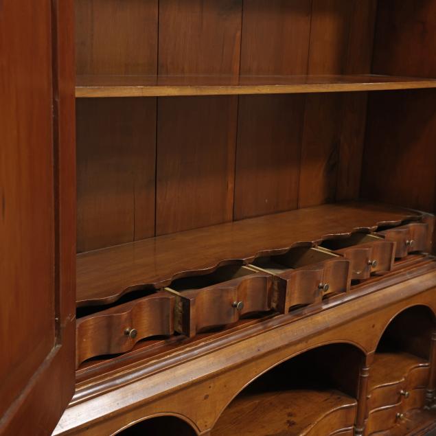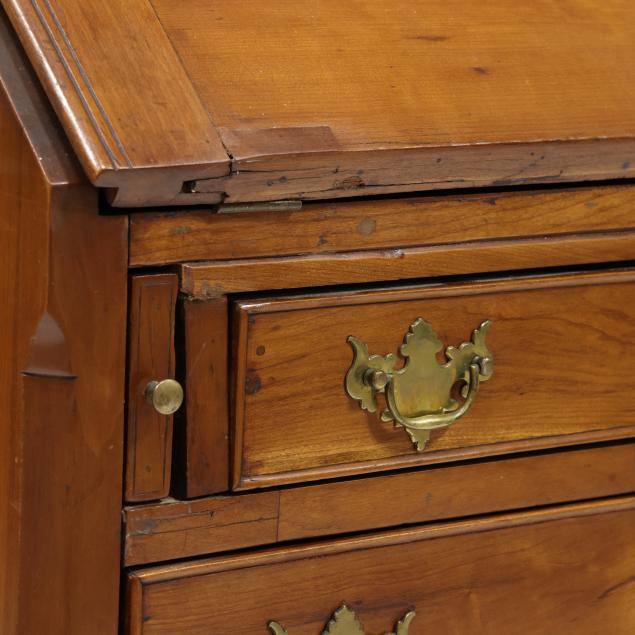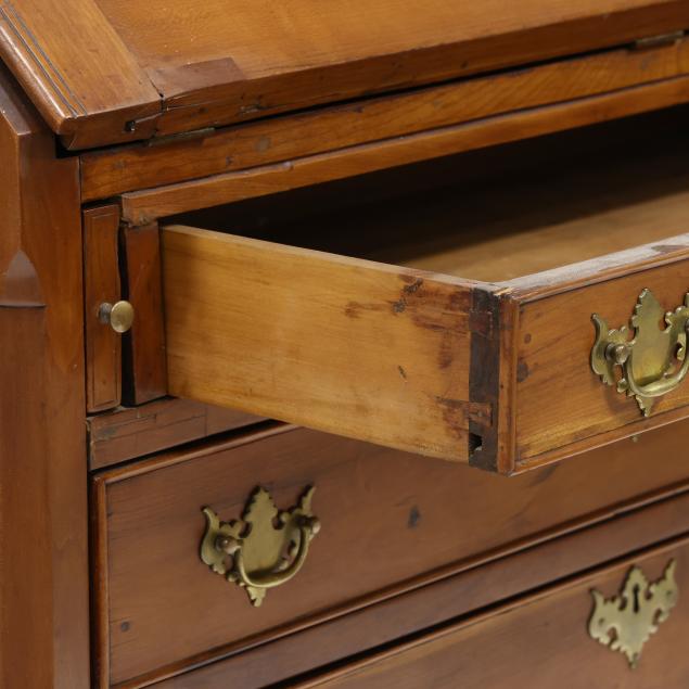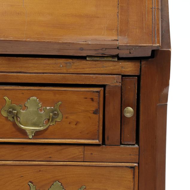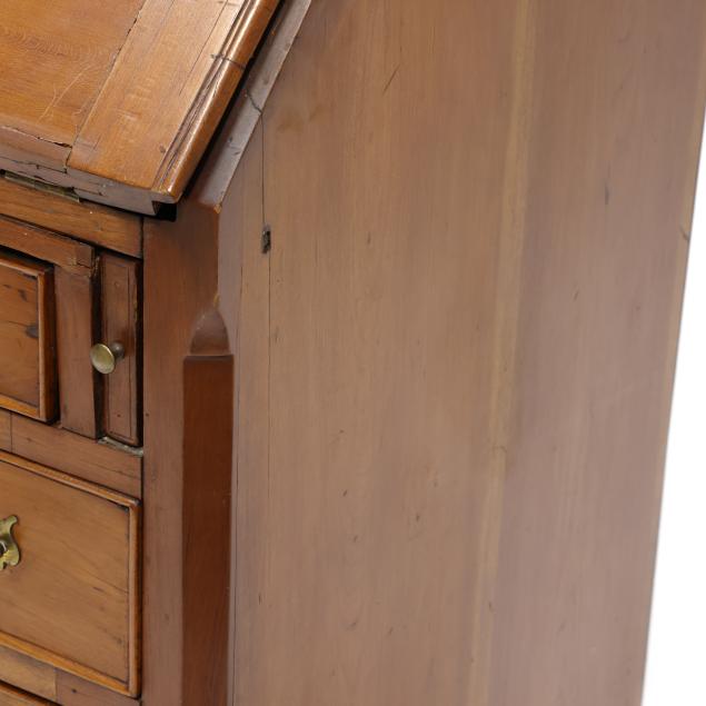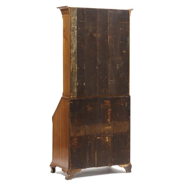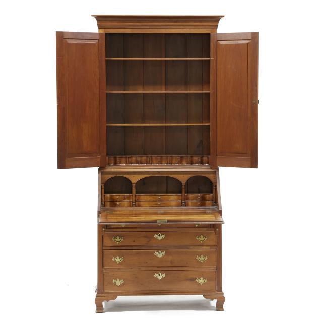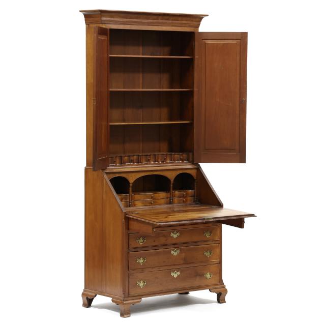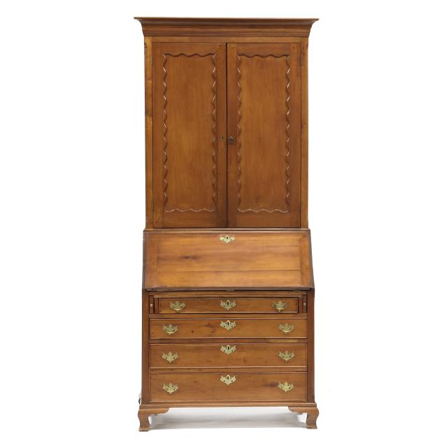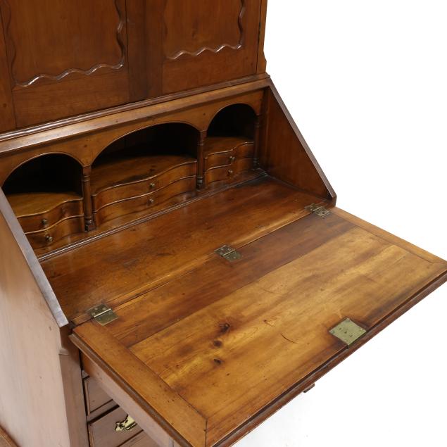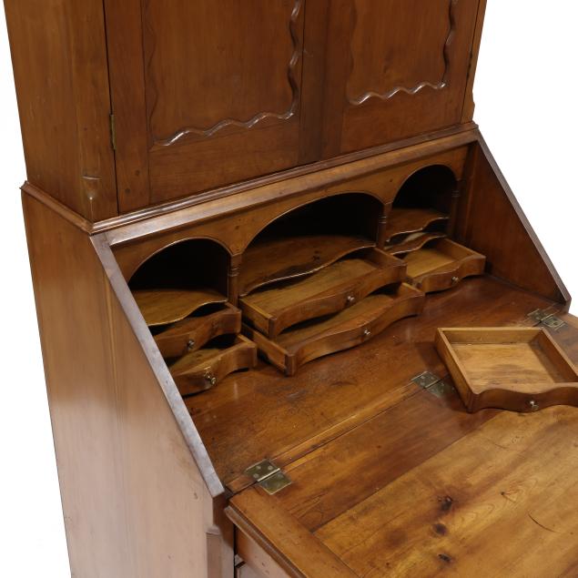 Attributed to Kentucky, late 18th century, two part form, white pine and poplar secondary, dovetailed construction, the upper case with applied cove molded and distinctive triple stepped cornice, two blind paneled hinged cabinet doors with scalloped edge, shelved interior with five lower serpentine small drawers, the desk with hinged bread board slant lid featuring a molded edge, loper supports, distinctive tri-part interior with three arched openings each above two small stacked serpentine drawers, applied half columns, four graduated cock beaded drawers, upper and lower case with chamfered corners and lamb's tongue, ogee bracket feet.